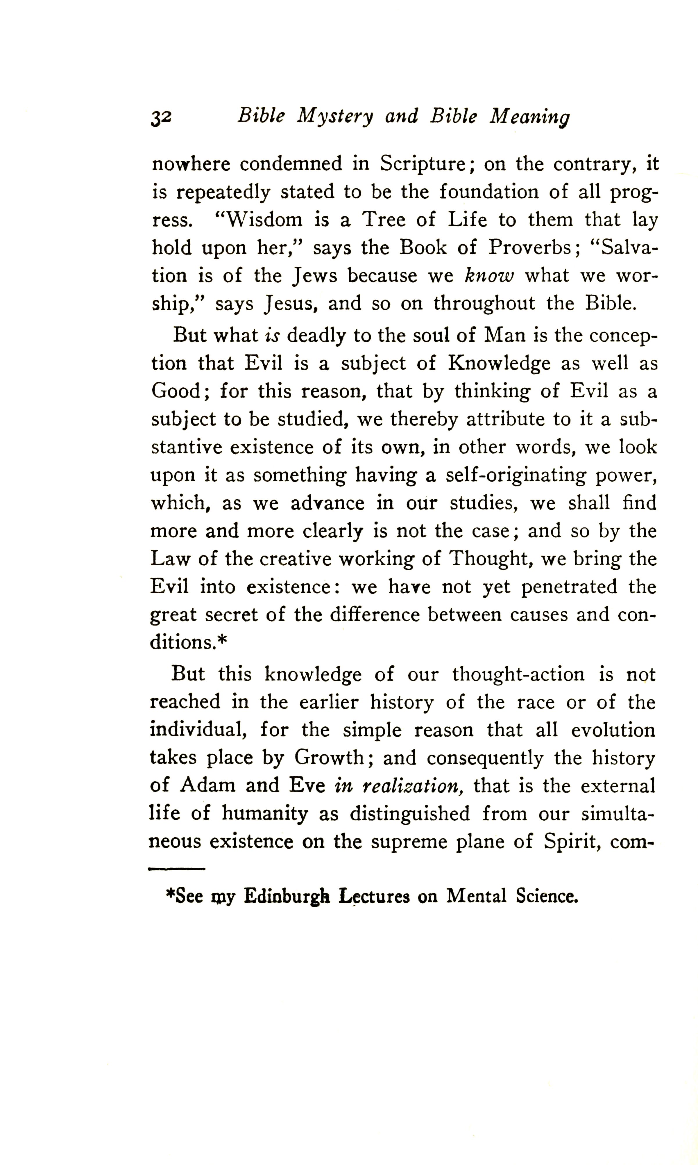 But this knowledge of our thought-action is not reached in the earlier history of the race or of the individual, for the simple reason that all evolution takes place by Growth; and consequently the history of Adam and Eve in realisation --- that is, the external life of humanity as distinguished from our simultaneous existence on the supreme plane of Spirit ---