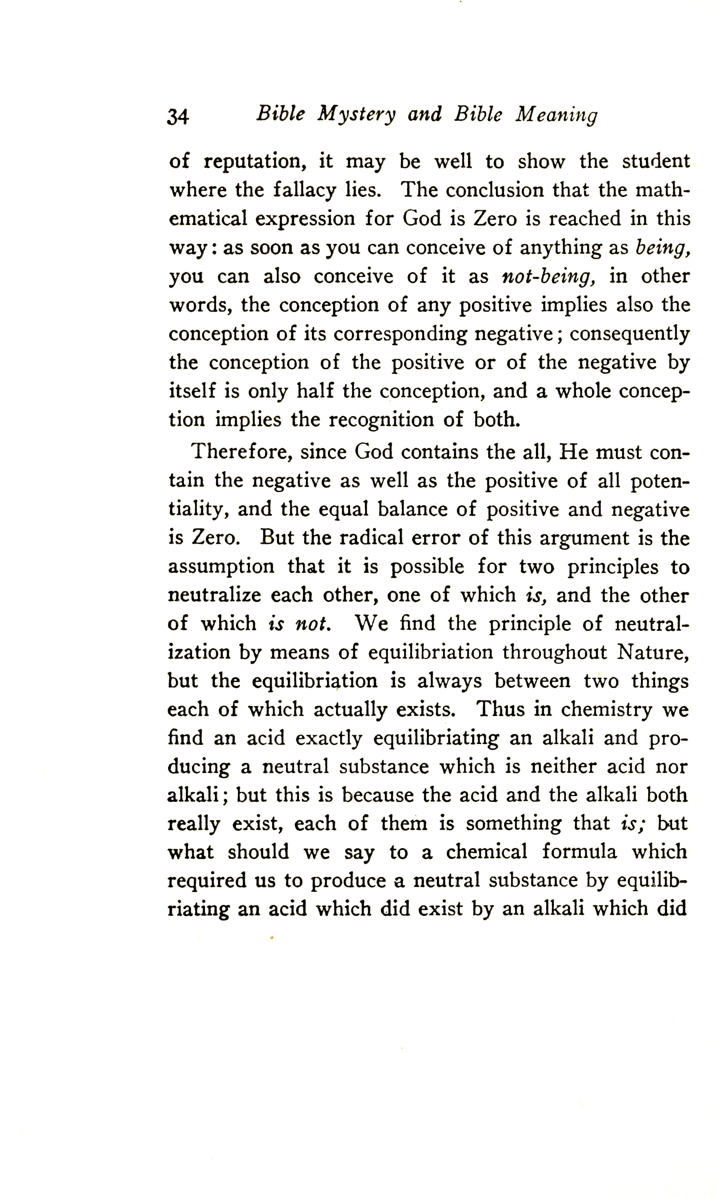 The conclusion that the mathematical expression of God is zero is reached in this way: as soon as you can conceive of anything as being, you can also conceive of it as not-being; in other words, the conception of any positive implies also the conception of its corresponding negative. Consequently, the conception of the positive or of the negative by itself is only half the conception, and a whole conception implies the recognition of both. Therefore, since God contains the all, He must contain the negative as well as the positive of all potentiality, and the equal balance of positive and negative is Zero. But the radical error of this argument is the assumption that it is possible for two principles to neutralise each other, one of which is and the other of which is not.
