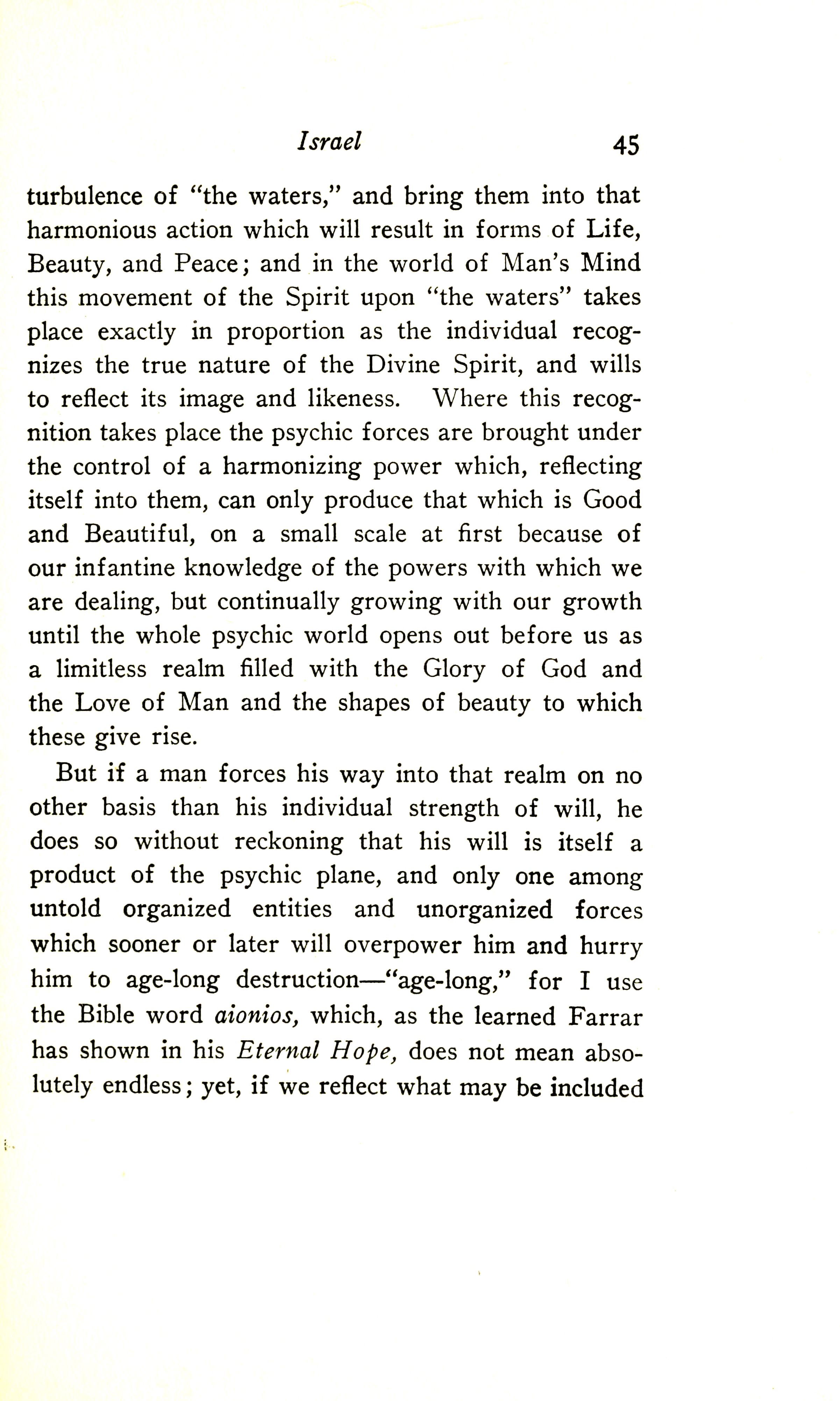 turbulence of "the waters" and bring them into that harmonious action which will result in forms of Life, Beauty, and Peace; and in the world of Man's Mind this movement of the Spirit upon "the waters" takes place exactly in proportion as the individual recognises the true nature of the Divine Spirit, and wills to reflect its image and likeness. Where this recognition takes place, the psychic forces are brought under the control of a harmonising power which, reflecting itself into them, can only produce that which is Good and Beautiful, on a small scale at first because of our infantile knowledge of the powers with which we are dealing, but continually growing with our growth until the whole psychic world opens out before us as a limitless realm filled with the Glory of God and the Love of Man and the shapes of beauty to which they give rise. But if a man forces his way into that realm on no other basis than his individual strength of will, he does so without reckoning that his will is itself a product of the psychic plane, and only one among untold organised entities and unorganised forces which sooner or later will overpower him and hurry him to age-long destruction --- "age-long", for I use the Bible word aionios which, as the learned Farrar has shown in his Eternal Hope, does not mean absolutely endless; yet, if we reflect what may be included