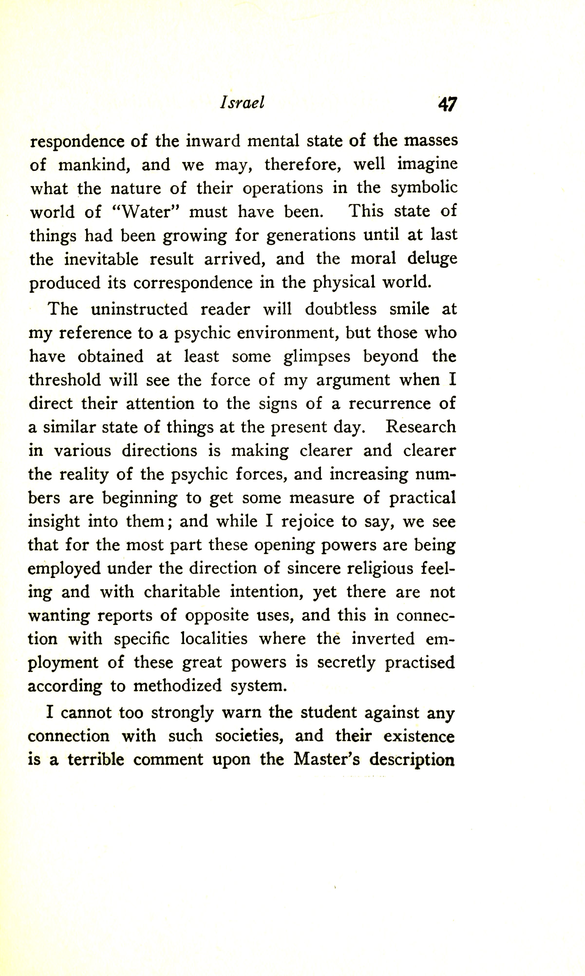 correspondence of the inward mental state of the masses of mankind and we may, therefore, well imagine what the nature of their operations in the symbolic world of "Water" must have been. This state of things had been growing for generations until at last the inevitable result arrived, and the moral deluge produced its correspondence in the physical world. The uninstructed reader will doubtless smile at my reference to a psychic environment, but those who have obtained at least some glimpses beyond the threshold will see the force of my argument when I direct their attention to the signs of a recurrence of a similar state of things at the present day. Research in various directions is making clearer and clearer the reality of the psychic forces, and increasing numbers are beginning to get some measure of practical insight into them; and while I rejoice to say that we see these opening powers being employed for the most part under the direction of sincere religious feeling and with charitable intention, yet there are not wanting reports of opposite uses, and this in connection with specific localities where the inverted employment of these great powers is secretly practised according to methodised system. I cannot too strongly warn the student against any connection with such societies, and their existence is a terrible comment upon the Master's description