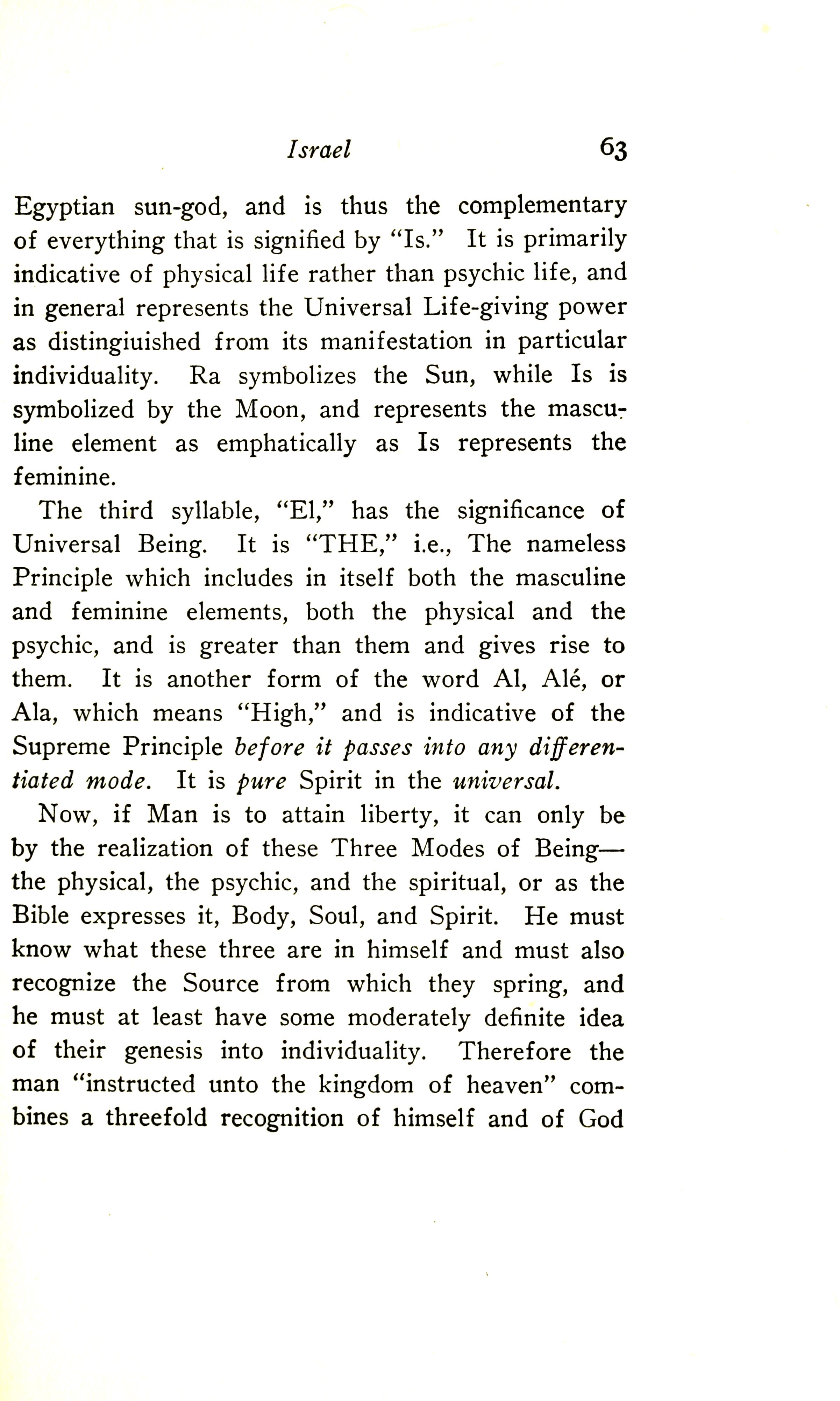 Now, if Man is to attain liberty, it can only be by the realisation of these Three Modes of Being --- the physical, the psychic, and the spiritual; or, as the Bible expresses it, Body, Soul, and Spirit. He must know what these three are in himself and must also recognise the Source from which they spring, and he must at least have some moderately definite idea of their genesis into individuality. Therefore the man "instructed unto the kingdom of heaven" combines a threefold recognition of himself and of God