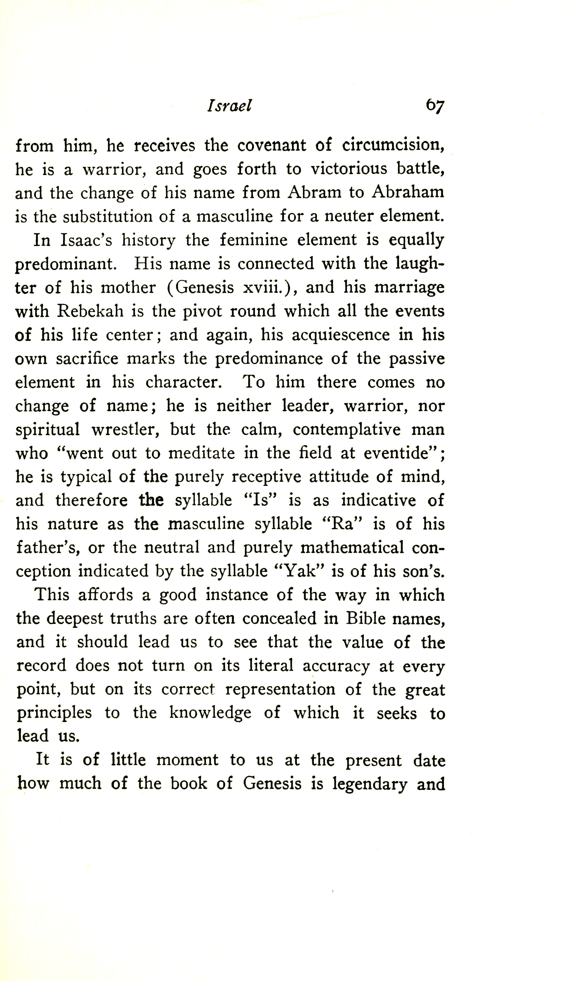 from him, he receives the covenant of circumcision, he is a warrior and goes forth to victorious battle, and the change of his name from Abram to Abraham is the substitution of a masculine for a neuter element. In Isaac's history the feminine element is equally predominant. His name is connected with the laughter of his mother (Genesis 18), and his marriage with Rebekah is the pivot round which all the events of his life centre; and again, his acquiescence in his own sacrifice marks the predominance of the passive element in his character. To him there comes no change of name; he is neither leader, warrior, nor spiritual wrestler, but the calm, contemplative man who "went out to meditate in the field at eventide"; he is typical of the purely receptive attitude of mind, and therefore the syllable "Is" is as indicative of his nature as the masculine syllable "Ra" is of his father's, or the neutral and purely mathematical conception indicated by the syllable "Yak" of his son's.