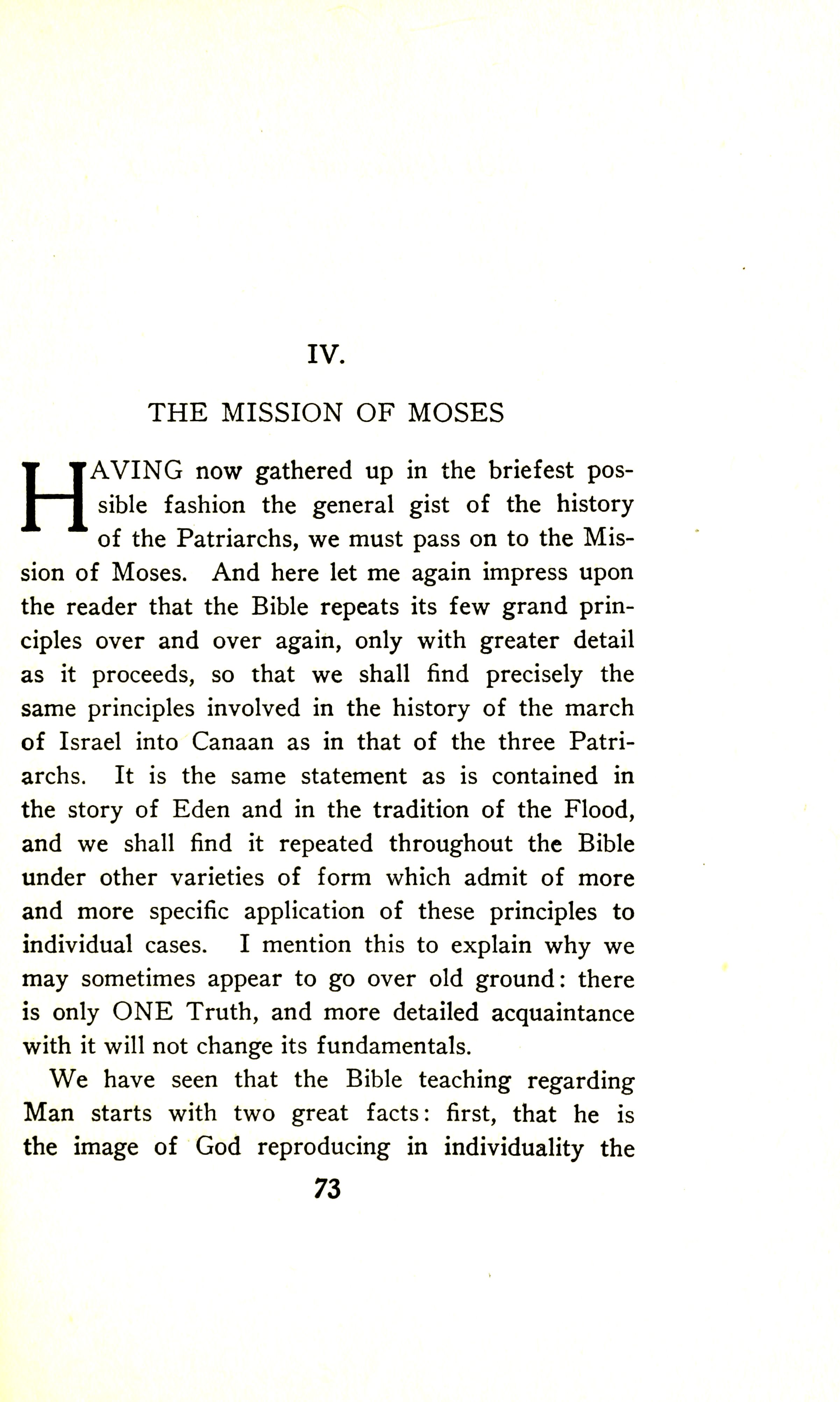 Having now gathered up in the briefest possible fashion the general gist of the history of the Patriarchs, we must pass on to the mission of Moses. And here let me impress upon the reader that the Bible repeats its few grand principles over and over again, only with greater detail as it proceeds, so that we shall find precisely the same principles involved in the history of the march of Israel into Canaan as in that of the three Patriarchs. It is the same statement as is contained in the story of Eden and in the tradition of the Flood, and we shall find it repeated throughout the Bible under other varieties of form which admit of more and more specific application of these principles to individual cases. I mention this to explain why we may sometimes appear to go over old ground: there is only ONE Truth, and more detailed acquaintance with it will not change its fundamentals.