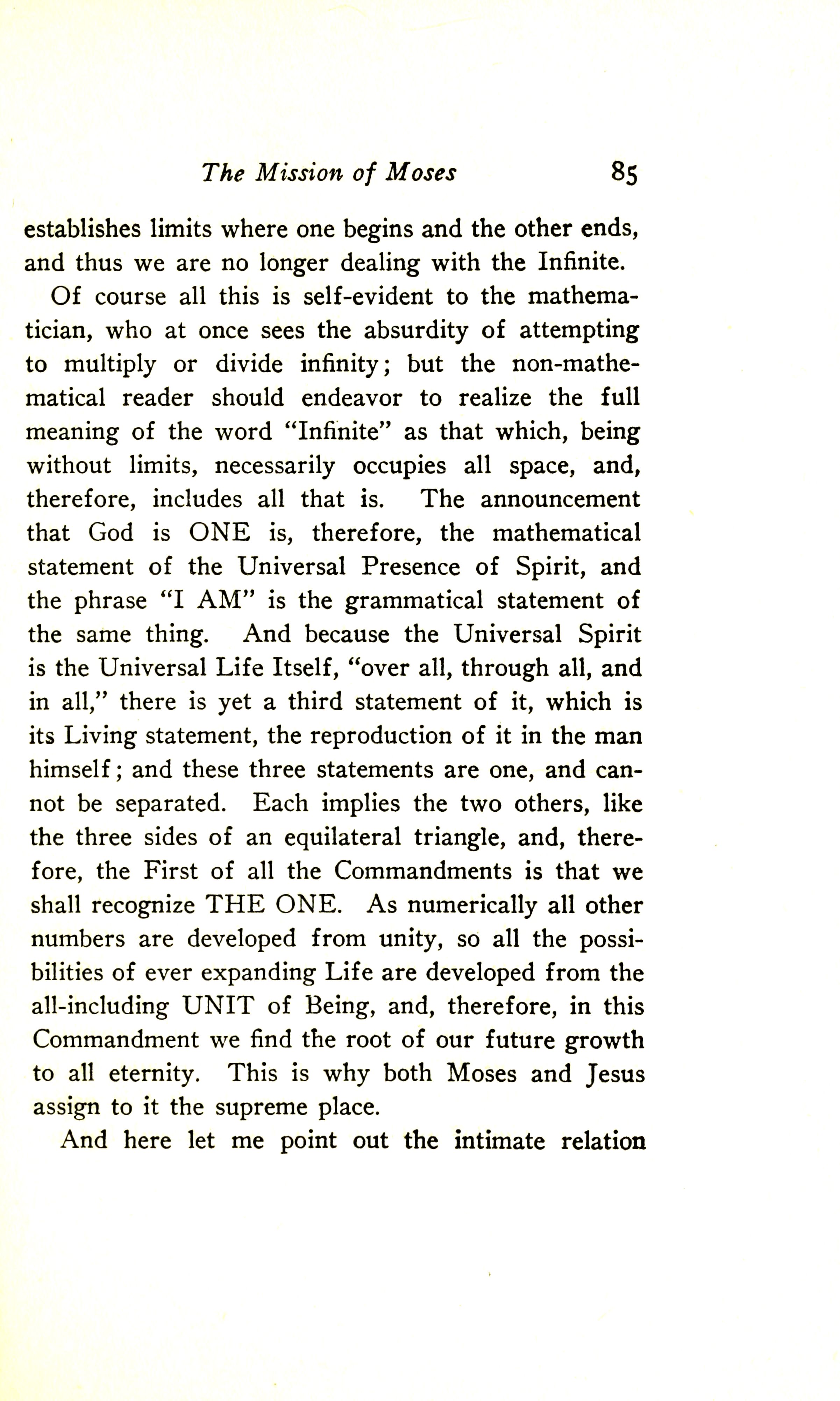 And because the Universal Spirit is the Universal Life Itself, "over all, through all, and in all", there is yet a third statement of it, which is its Living statement: the reproduction of it in the man himself; and these three statements are one and cannot be separated. Each implies the two others, like the three sides of an equilateral triangle, and therefore the First of all the Commandments is that we shall recognise THE ONE. As numerically all other numbers are developed from unity, so all the possibilities of ever-expanding Life are developed from the All-including UNIT of Being, and therefore in this Commandment we find the root of our future growth to all eternity. This is why both Moses and Jesus assign to it the supreme place.
