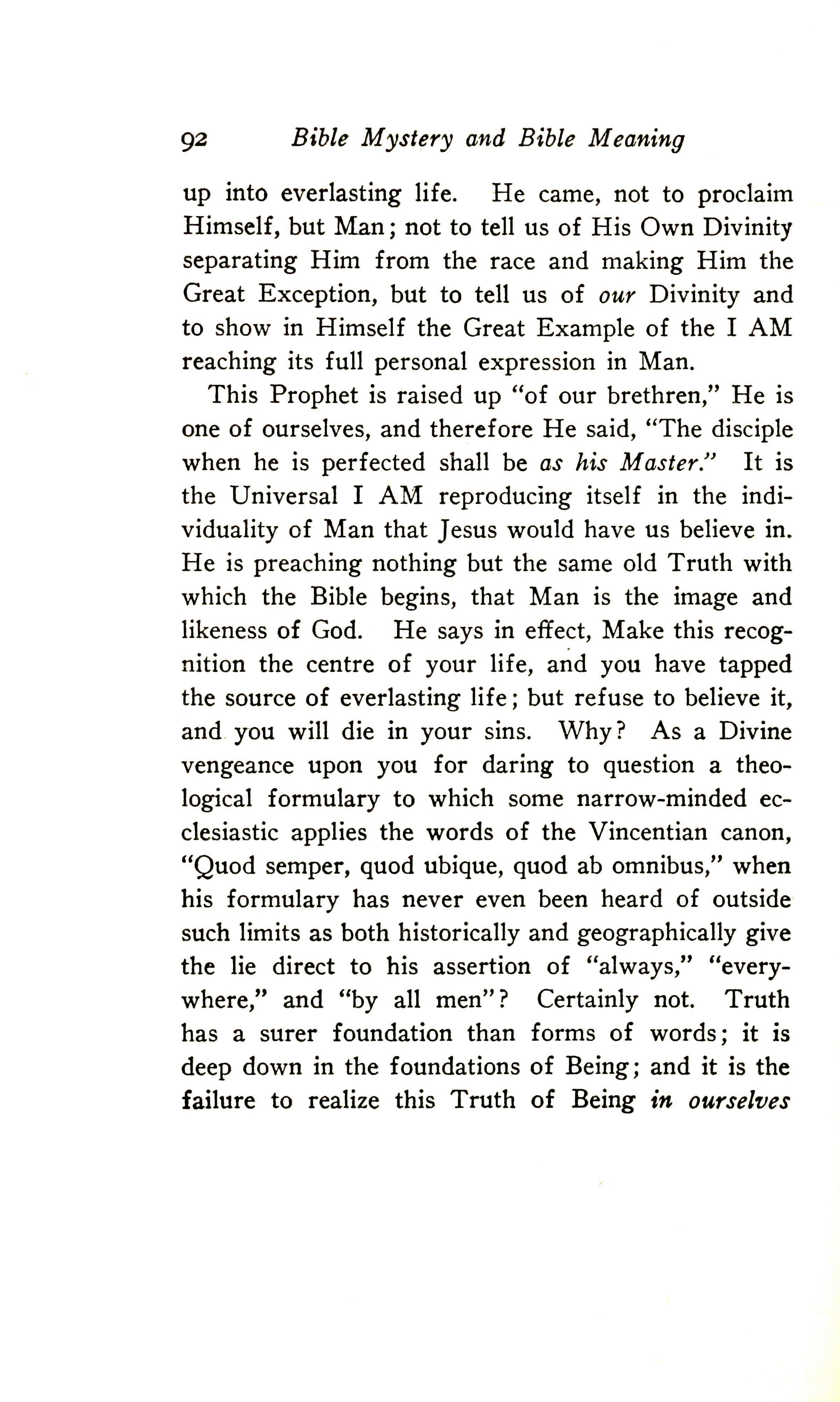 This Prophet is raised up "of our brethren", he is one of ourselves, and therefore he said, "The disciple when he is perfected shall be as his Master". It is the Universal I AM reproducing itself in the individuality of Man that Jesus would have us believe in. He is preaching nothing but the same old Truth with which the Bible begins, that Man is the image and likeness of God. He says, in effect, Make this recognition the centre of your life and you have tapped the source of everlasting life; but refuse to believe it and you will die in your sins. Why? As a Divine vengeance upon you for daring to question a theological formulary to which some narrow-minded ecclesiastic applies the words of the Vincentian canon, "Quod semper, quod ubique, quod ab omnibus", when his formulary has never even been heard outside such limits as both historically and geographically give the lie direct to his assertion of "always", "everywhere", and "by all men"? Certainly not. Truth has a surer foundation than forms of words; it is deep down in the foundations of Being; and it is the failure to realise this Truth of Being in ourselves