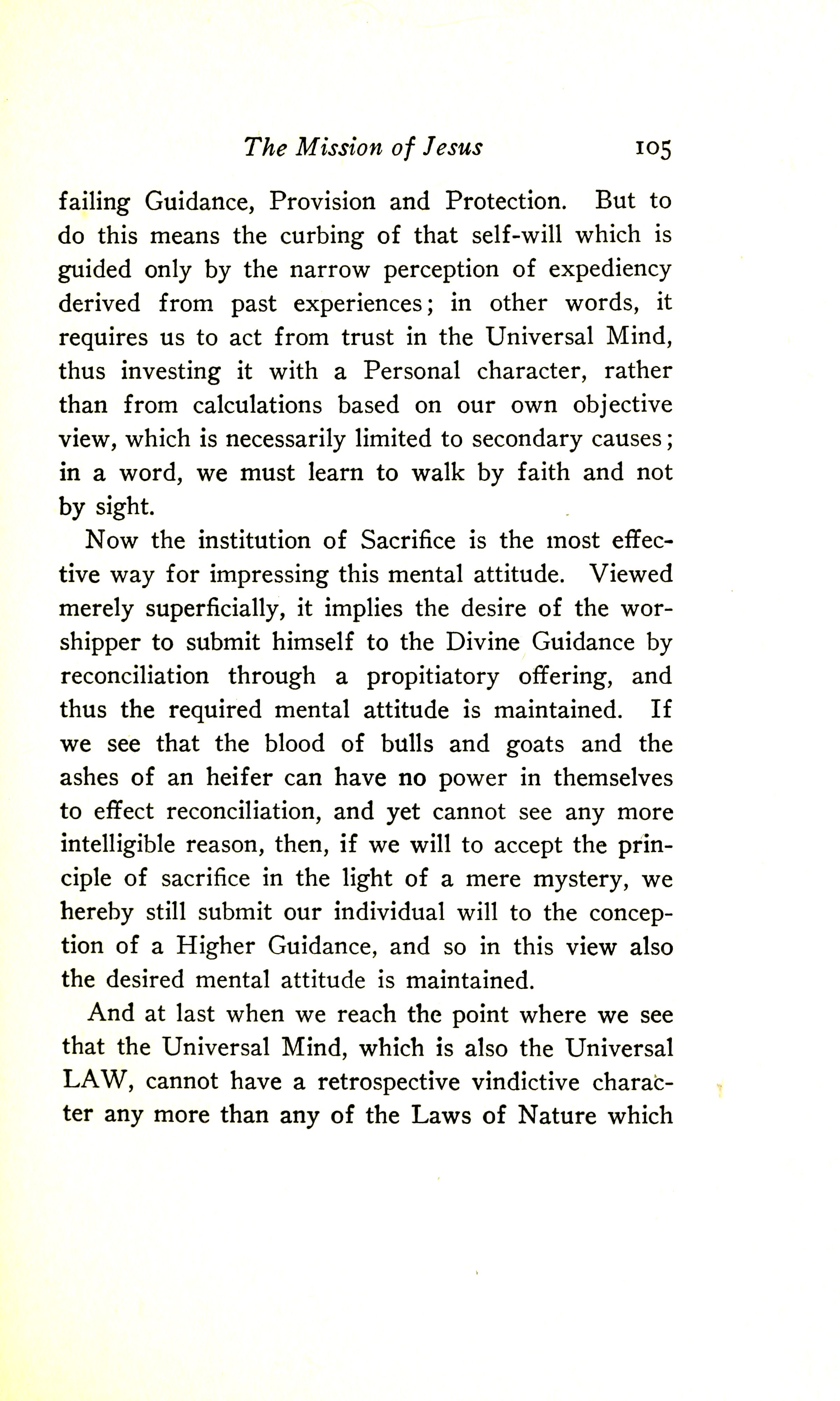 unfailing Guidance, Provision, and Protection. But to do this means the curbing of that self-will which is guided only by the narrow perception of expediency derived from past experiences; in other words, it requires us to act from trust in the Universal Mind, thus investing it with a Personal character, rather than from calculations based on our own objective view, which is necessarily limited to secondary causes. In a word, we must learn to walk by faith and not by sight.