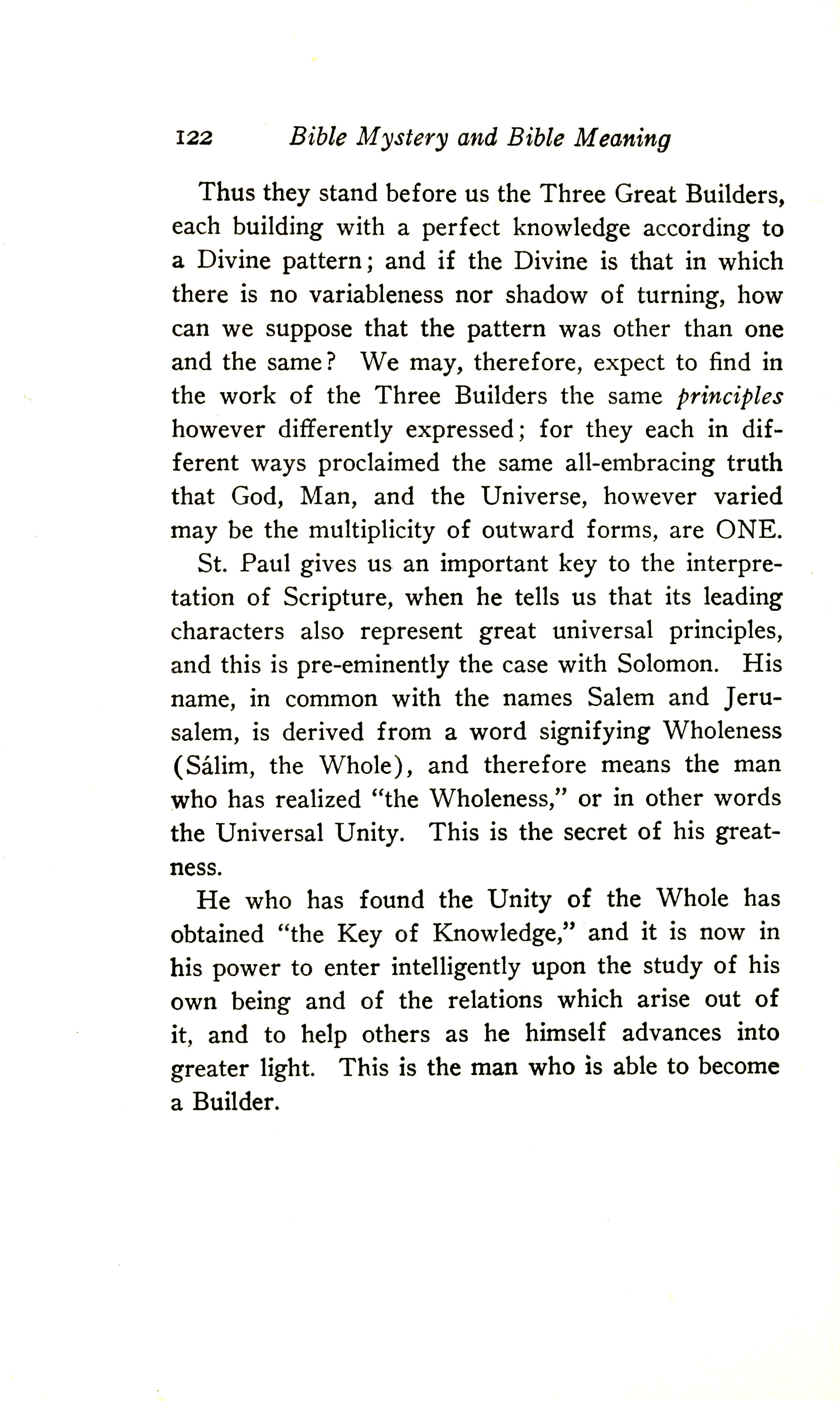 Thus they stand before us the Three Great Builders, each building with a perfect knowledge according to a Divine pattern; and if the Divine is that in which there is no variableness of shadow of turning (James 1:17), how can we suppose that the pattern was other than one and the same? We may, therefore, expect to find in the work of the three Builders the same principles, however differently expressed; for they each in different ways proclaimed the same all-embracing truth that God, Man, and the Universe, however varied may be the multiplicity of outward forms, are ONE. St Paul gives us an important key to the interpretation of Scripture when he tells us that its leading characters also represent great universal principles, and this is pre-eminently the case with Solomon. His name, in common with the names Salem and Jerusalem, is derived from a word signifying Wholeness (Sálim, the Whole), and therefore means the man who has realised "the Wholeness", or in other words the Universal Unity. This is the secret of his greatness.