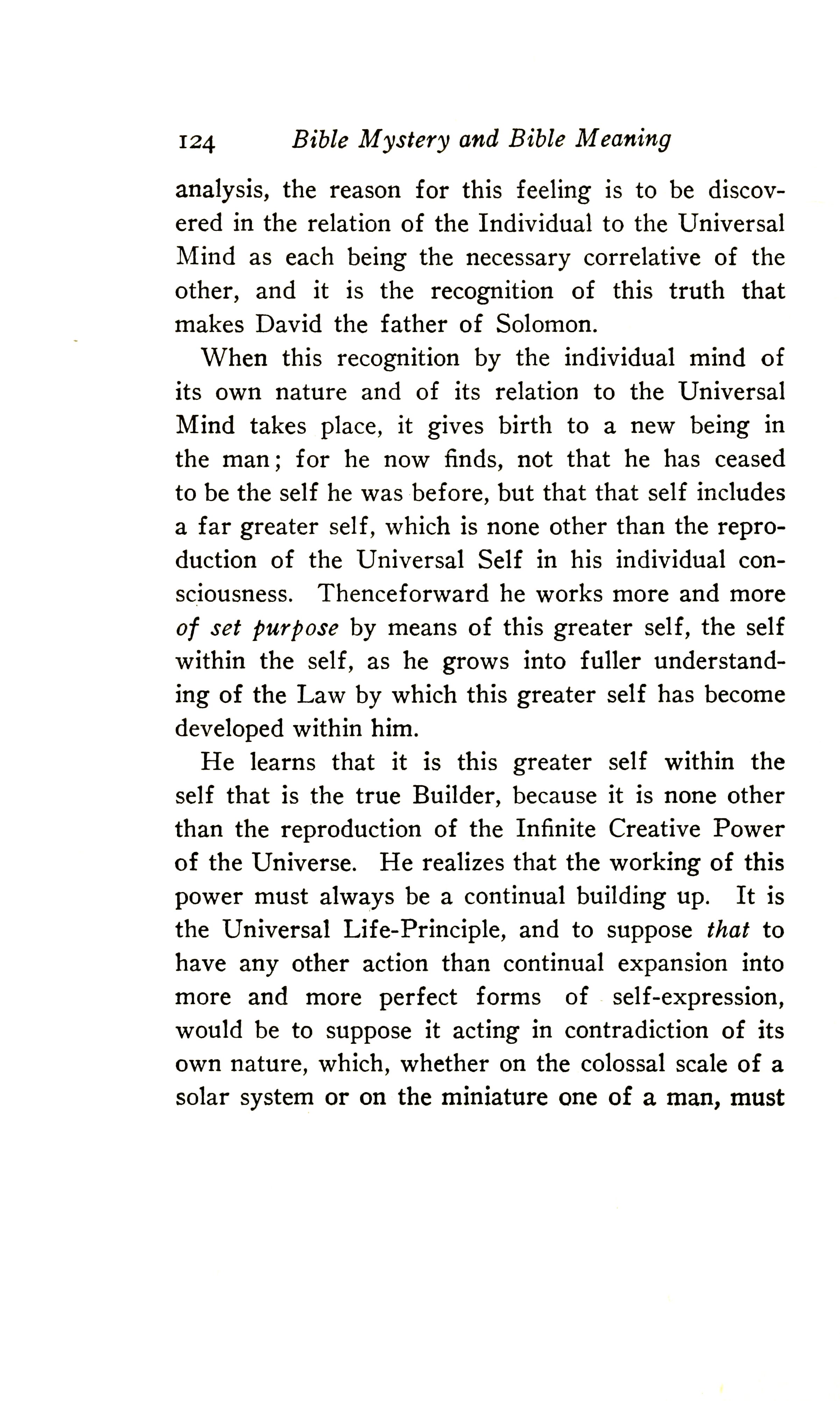 analysis, the reason for this feeling is to be discovered in the relation of the Individual to the Universal Mind as each being the necessary correlative of the other, and it is the recognition of this truth that makes David the father of Solomon.