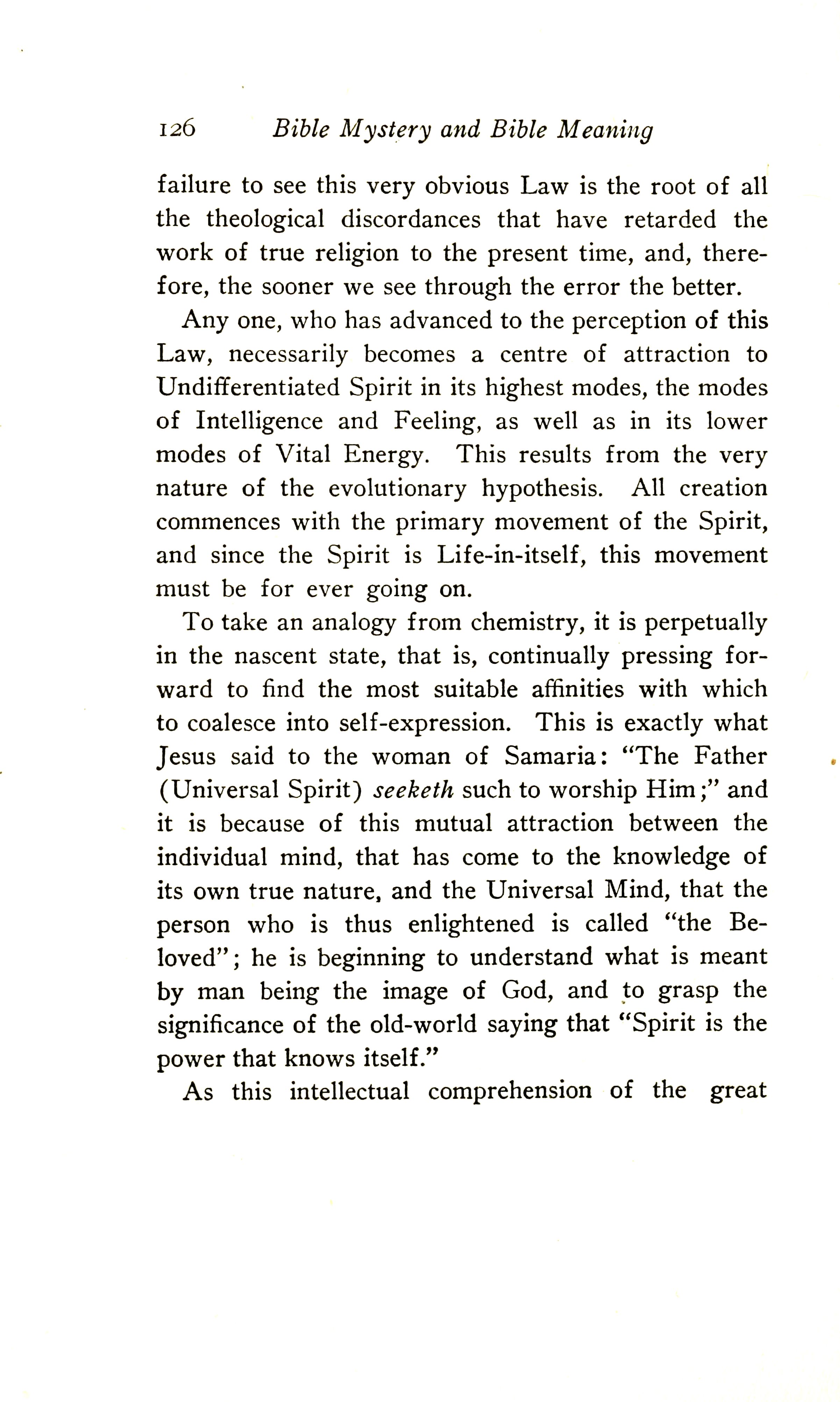 To take an analogy from chemistry, it is perpetually in the nascent state --- that is, continually pressing forward to find the most suitable affinities with which to coalesce into self-expression. This is exactly what Jesus said to the woman of Samaria: "The Father (Universal Spirit) seeketh such to worship Him [John 4:23]; and it is because of this mutual attraction between the individual mind that has come to the knowledge of its own true nature and the Universal Mind that the person who is thus enlightened is called "the Beloved"; he is beginning to understand what is meant by Man being the image of God and to grasp the significance of the old-world saying that "Spirit is the power that knows itself".