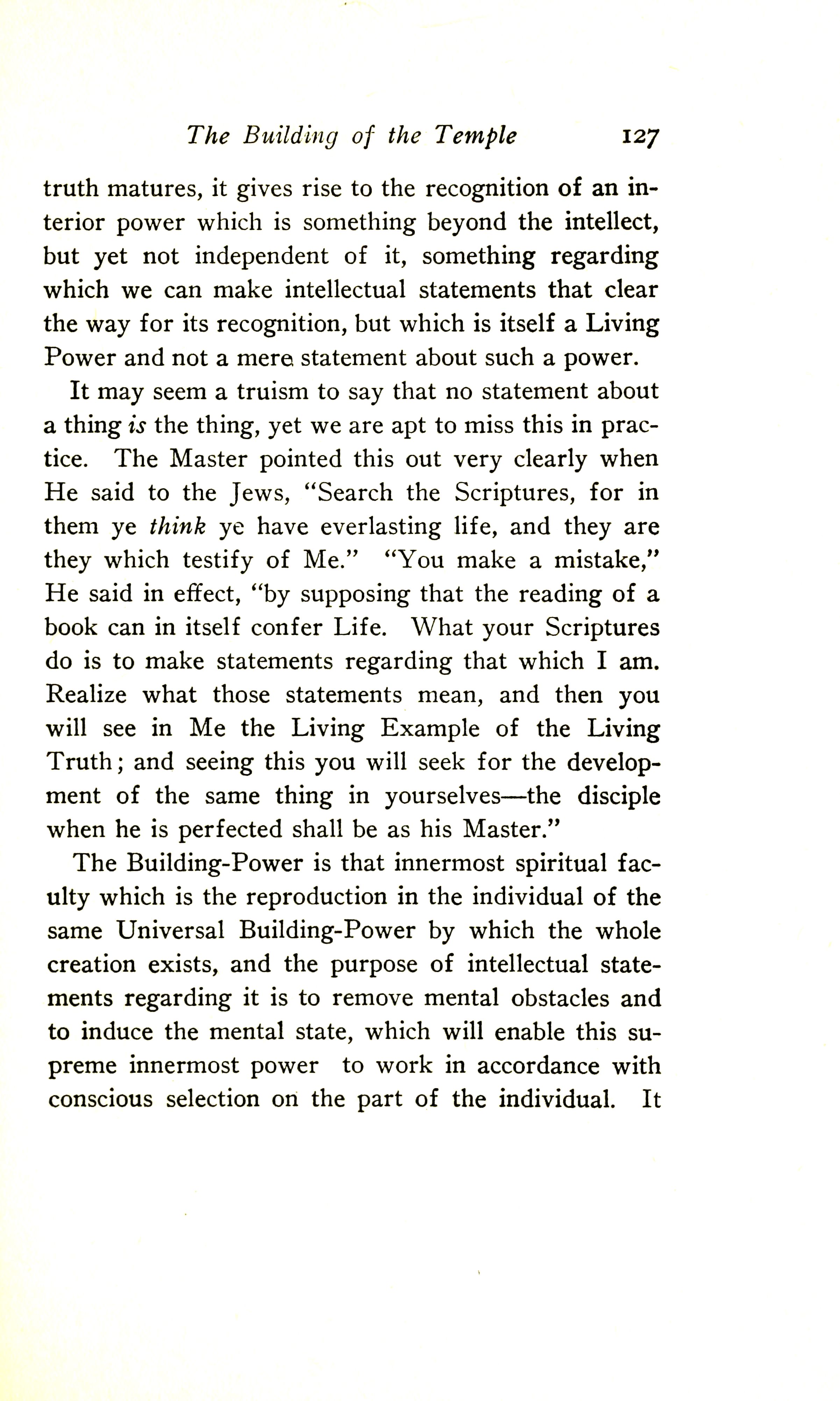 It may seem a truism to say that no statement about a thing is the thing, yet we are apt to miss this in practice. The Master pointed this out very clearly when he said to the Jews, "Search the Scriptures, for in them ye think ye have everlasting life, and they are they which testify of Me" (John 5:39). He said in effect, "You make a mistake by supposing that the reading of a book can in itself confer Life. What your Scriptures do is to make statements regarding that which I am. Realise what those statements mean, and then you will see in me the living example of the Living Truth; and seeing this, you will seek for the development of the same thing in yourselves. The disciple, when perfected, shall be as his Master".