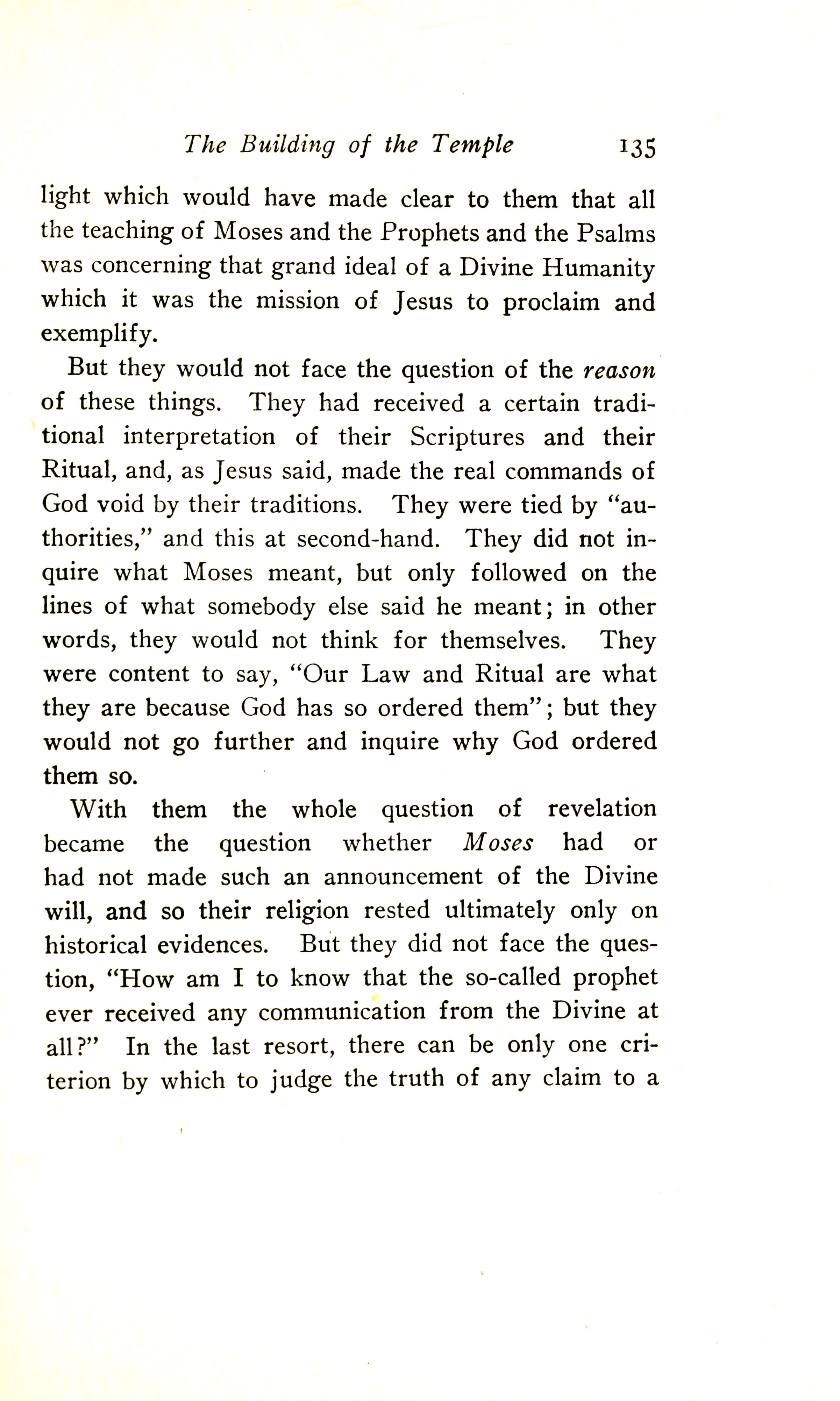 With them, the whole question of revelation became the question whether Moses had or had not made such an announcement of the Divine Will, and so their religion rested ultimately only on historical evidences. But they did not face the question, "How am I to know that the so-called prophet ever received any communication from the Divine at all?" In the last resort, there can be only one criterion by which to judge the truth of any claim to a