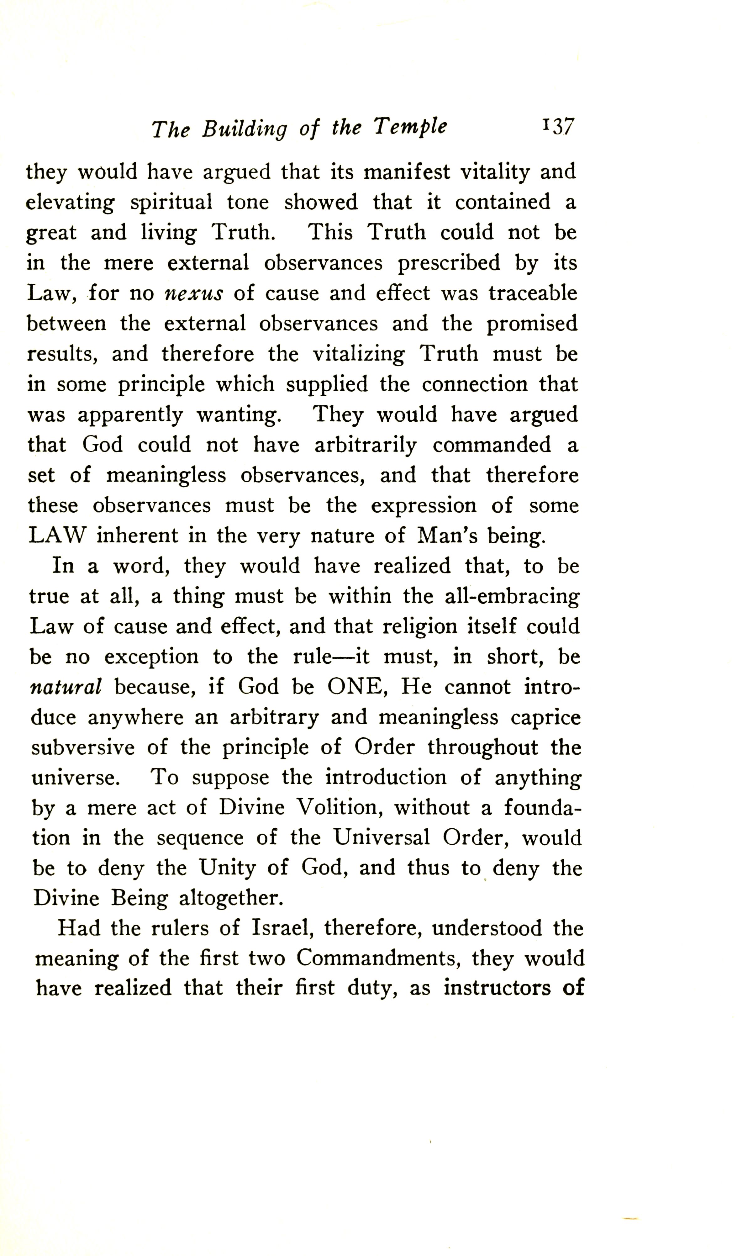 In a word, they would have realised that, to be true at all, a thing must be within the All-embracing Law of Cause and Effect, and that religion itself could be no exception to the rule --- it must, in short, be natural because, if God be ONE, He cannot introduce anywhere an arbitrary and meaningless caprice subversive of the principle of Order throughout the Universe. To suppose the introduction of anything by a mere act of Divine Volition, without a foundation in the sequence of the Universal Order, would be to deny the Unity of God, and thus to deny the Divine Being altogether.