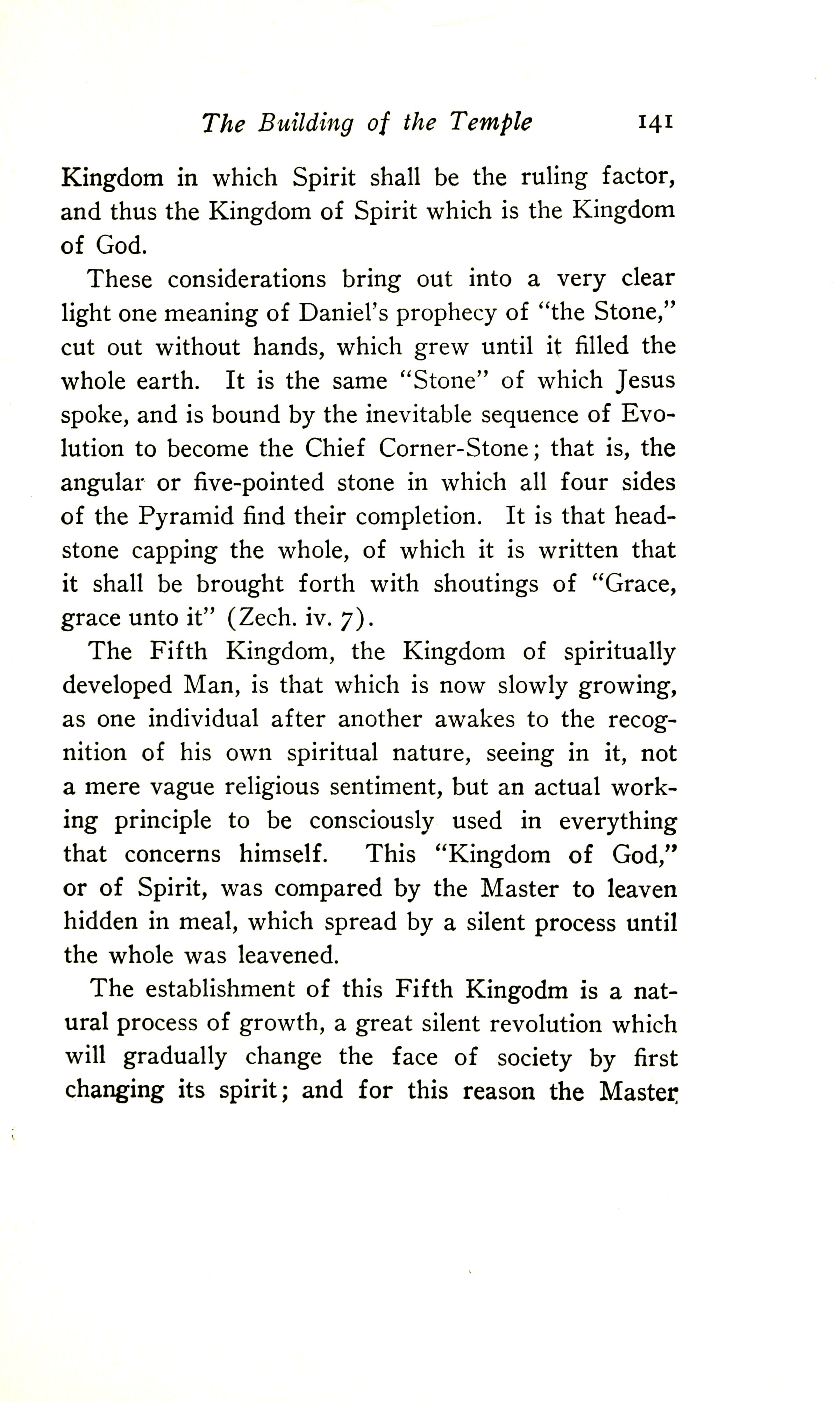 The Fifth Kingdom, the Kingdom of spiritually developed Man, is that which is now slowly growing, as one individual after another awakes to the recognition of his own spiritual nature, seeing in it not a mere vague religious sentiment but an actual working principle to be consciously used in everything that concerns himself. This "Kingdom of God", or of Spirit, was compared by the Master to leaven hidden in meal, which spread by a silent process until the whole was leavened. The establishment of this Fifth Kingdom is a natural process of growth, a great silent revolution which will gradually change the face of society by first changing its spirit; and for this reason the Master