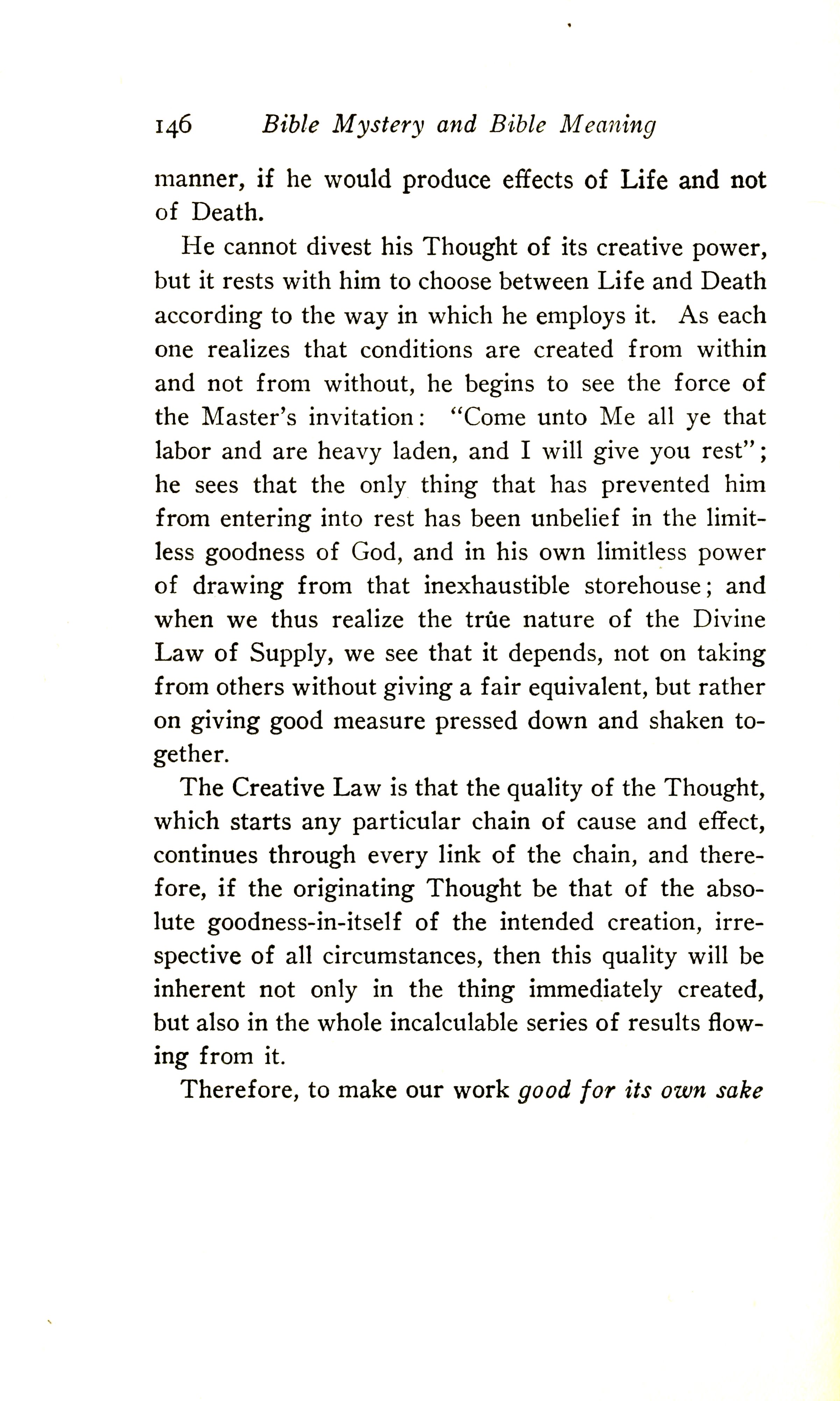 He cannot divest his Thought of its creative power, but it rests with him to choose between Life and Death according to the way in which he employs it. As each one realises that conditions are created from within and not from without, he begins to see the force of the Master's invitation: "Come unto me all ye that labour and are heavy laden, and I will give you rest" (Matt. 11:28). He sees that the only thing that has prevented him from entering into rest has been unbelief in the limitless power of drawing from that inexhaustible storehouse; and when we thus realise the true nature of the Divine Law of Supply, we see that it depends not on taking from others without giving a fair equivalent, but rather on giving good measure pressed down and shaken together (Luke 6:38)