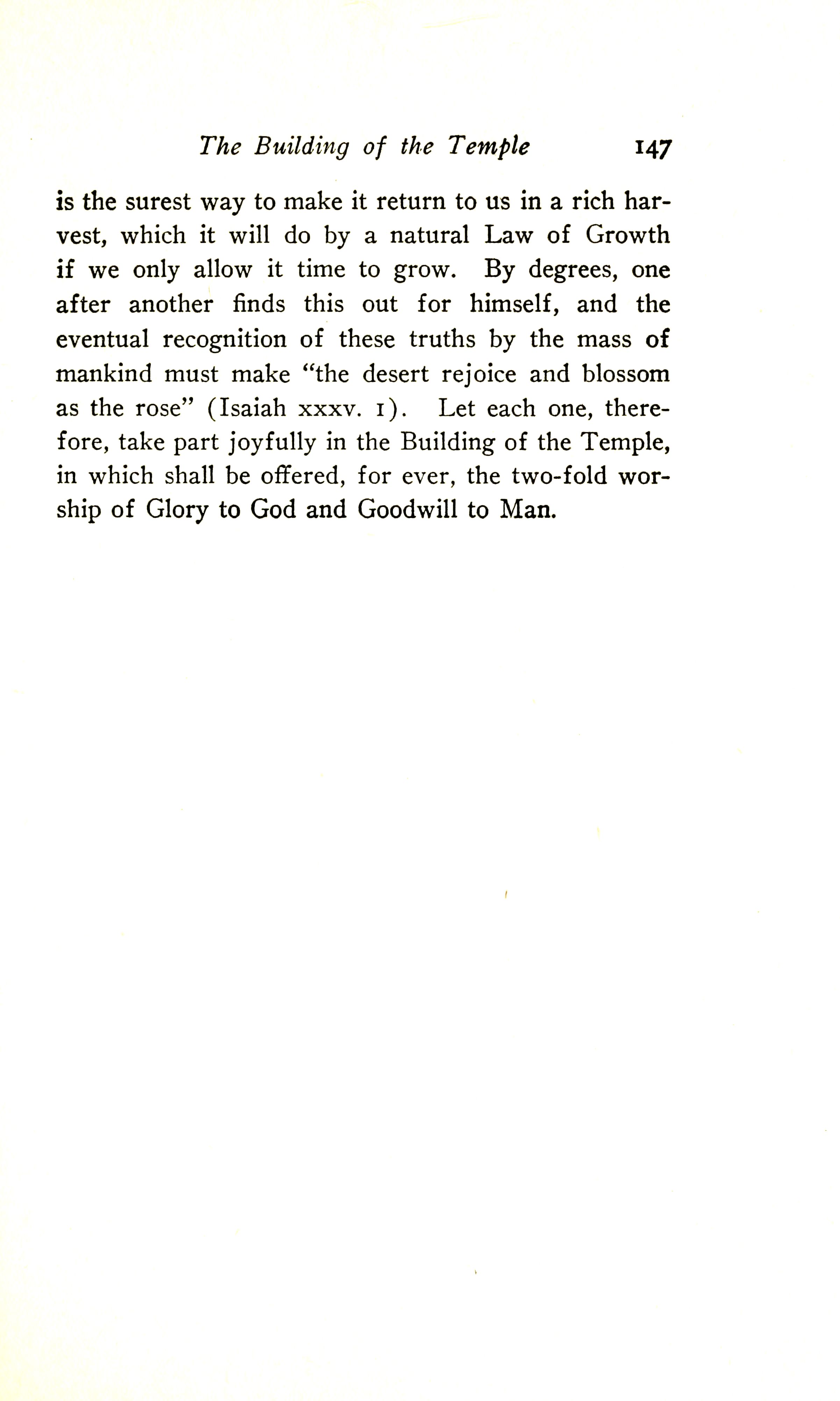 is the surest way to make it return to us in a rich harvest, which it will do by a natural Law of Growth if we only allow it time to grow. By degrees, one after another finds this out for himself, and the eventual recognition of these truths by the mass of mankind must make "the desert rejoice and blossom as the rose" (Isaiah 35:1). Let each one therefore take part joyfully in the Building of the Temple, in which shall be offered, forever, the twofold worship of Glory to God and Goodwill to Man.