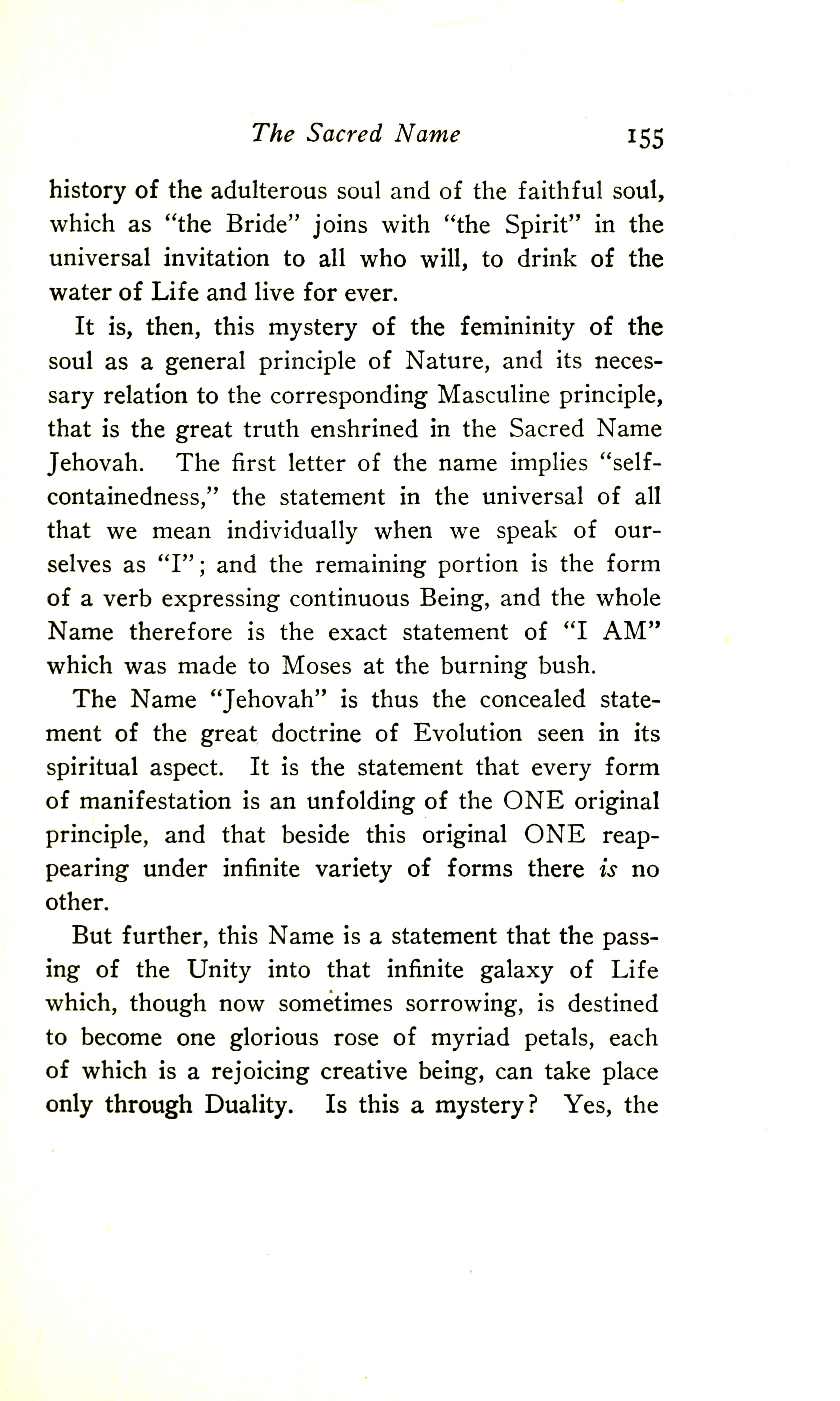 It is, then, this mystery of the femininity of the soul as a general principle of Nature, and its necessary relation to the corresponding Masculine principle, that is the great truth enshrined in the Sacred Name Jehovah. The first letter of the name implies "self-containedness", the statement in the universal of all that we mean individually when we speak of ourselves as "I"; and the remaining portion is the form of a verb expressing continuous Being; and the whole Name therefore is the exact statement of "I AM" which was made to Moses at the burning bush.