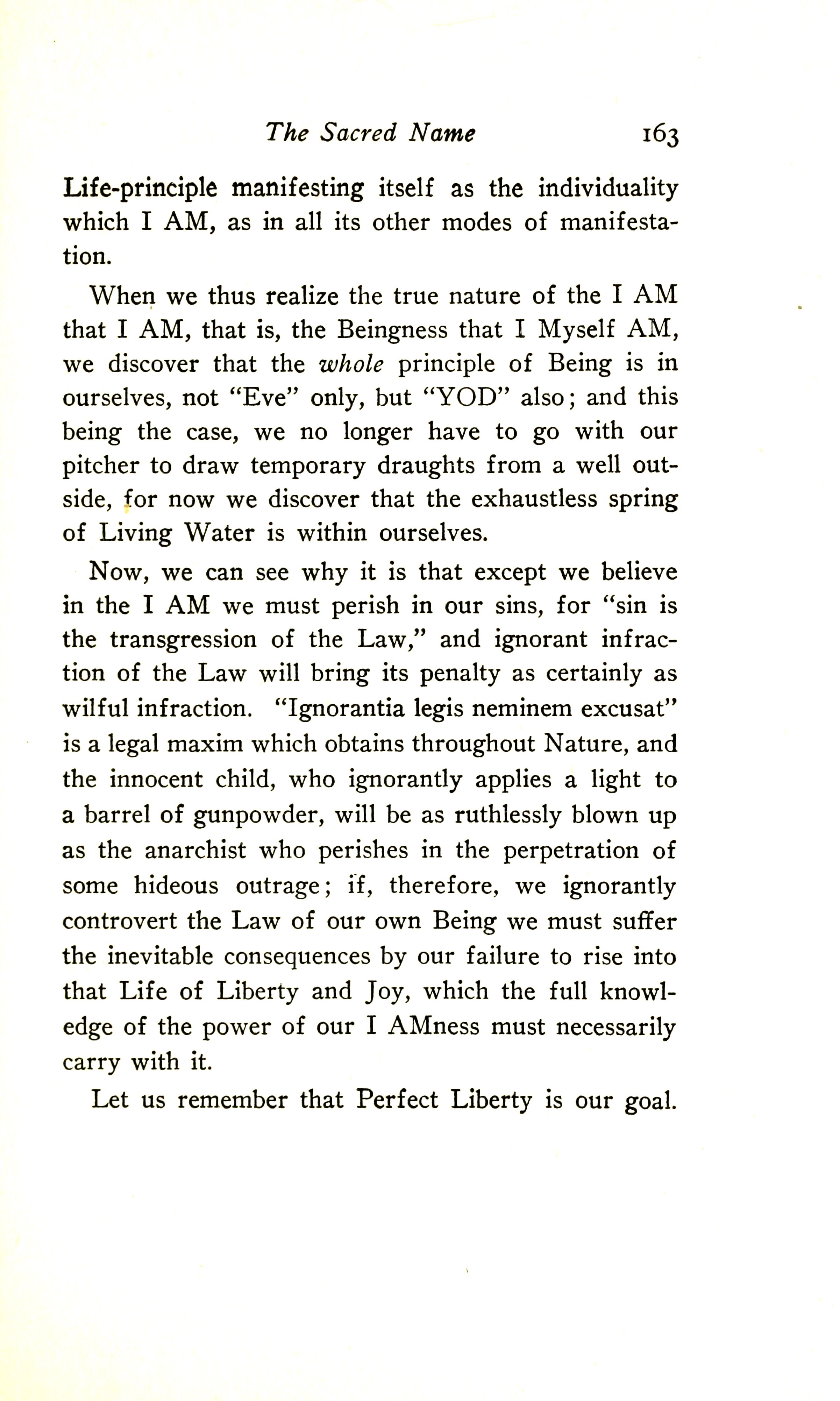 Now we can see why it is that except we believe in the I AM, we must perish in our sins, for "sin is the transgression of the Law", and ignorant infraction of the Law will bring its penalty as certainly as wilful infraction. "Ignorantia legis nominem excusat" is a legal maxim which obtains throughout Nature, and the innocent child who ignorantly applies a light to a barrel of gunpowder will be as ruthlessly blown up as the anarchist who perishes in the perpetration of some hideous outrage. If, therefore, we ignorantly controvert the Law of our own Being, we must suffer the inevitable consequences by our failure to rise into that Life of Liberty and Joy which the full knowledge of the power of our I AM-ness must necessarily carry with it.
