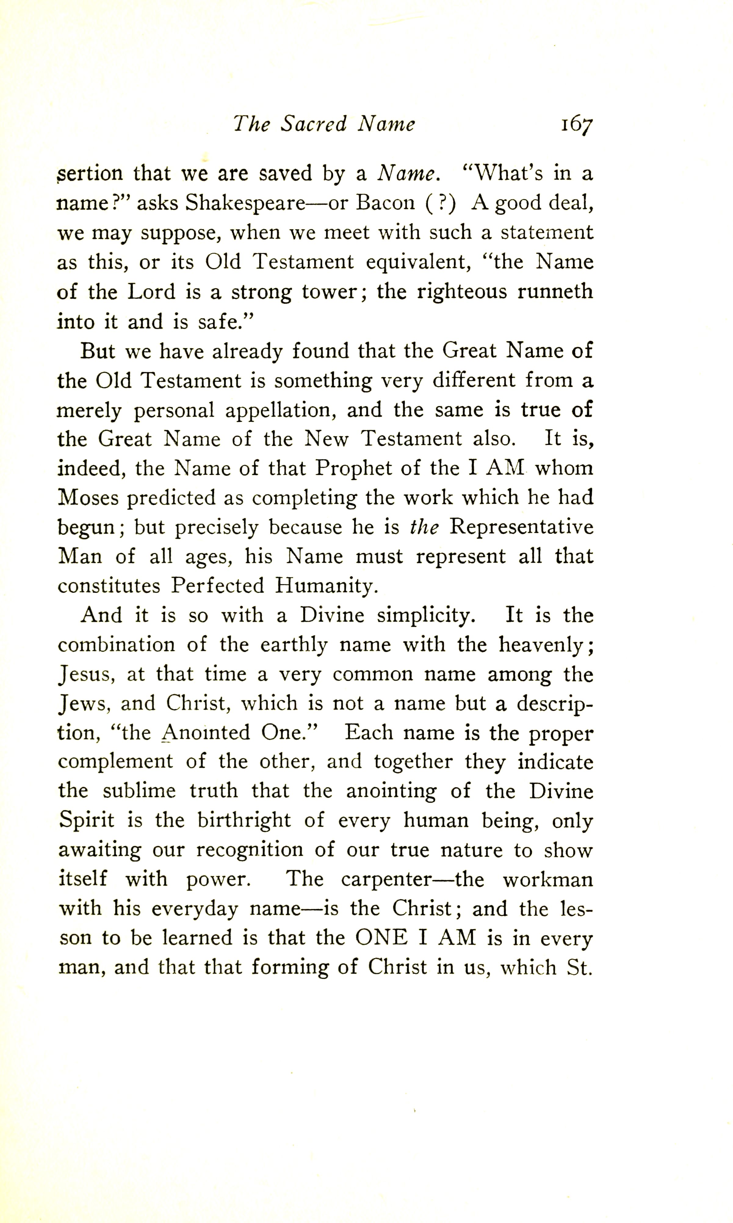 And it is so with a Divine simplicity. It is the combination of the earthly name with the heavenly: Jesus, at the time a very common name among the Jews, and Christ, which is not a name but a description, "the Anointed One". Each name is the proper complement of the other, and together they indicate the sublime truth that the anointing of the Divine Spirit is the birthright of every human being, only awaiting our recognition of our true nature to show Itself with power. The carpenter --- the workman with his everyday name --- is the Christ; and the lesson to be learned is that the ONE I AM is in every man, and that that forming of Christ in us which