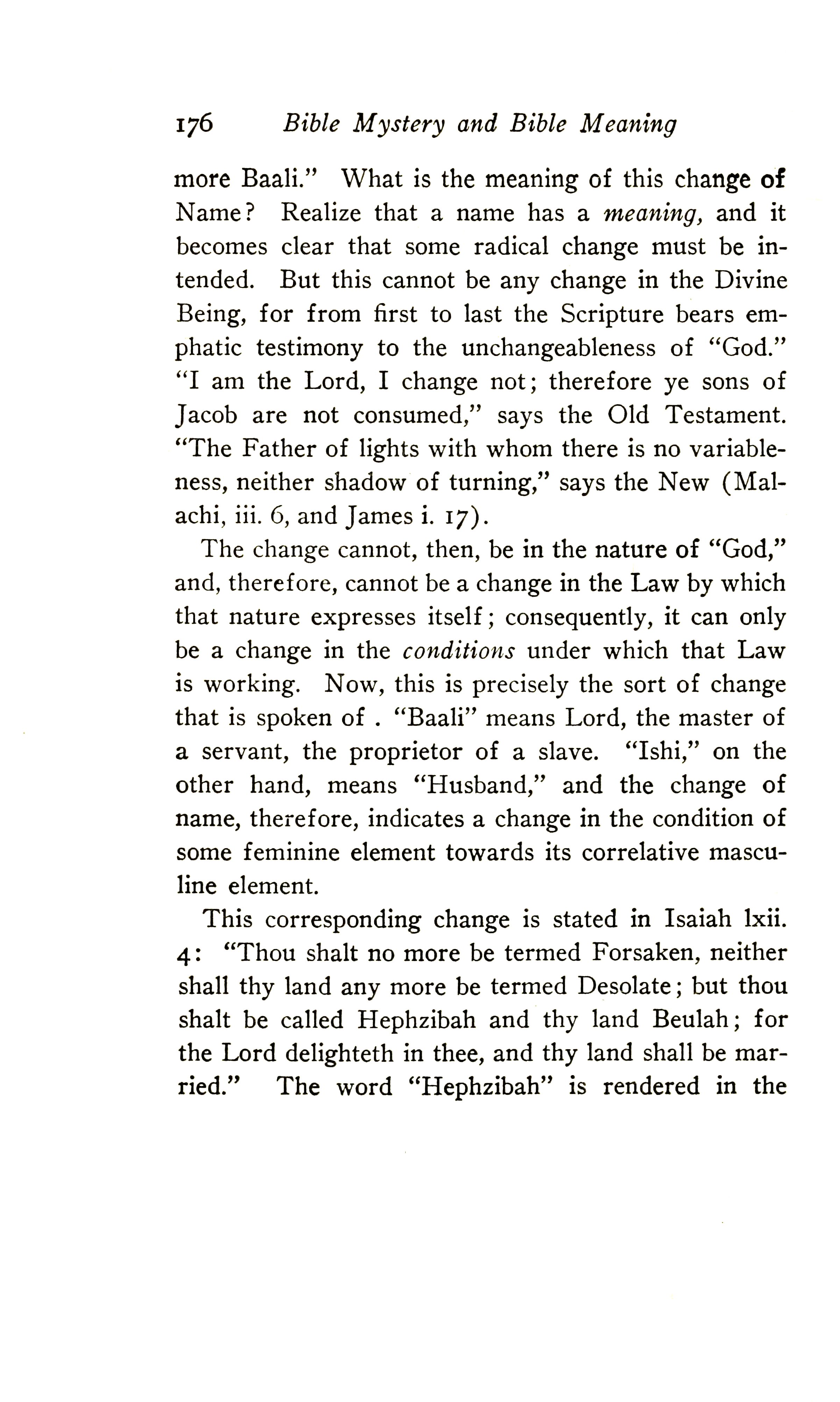 more Baali". What is the meaning of this change of Name? Realise that a name has a meaning, and it becomes clear that some radical change must be intended. But this cannot be any change in the Divine Being, for from first to last the Scripture bears emphatic testimony to the unchangeableness of "God". "I AM the Lord, I change not; therefore ye sons of Jacob are not consumed", says the Old Testament (Malachi 3:6); "The Father of light with whom there is no variableness, neither shadow of turning", says the New (James 1:17).
