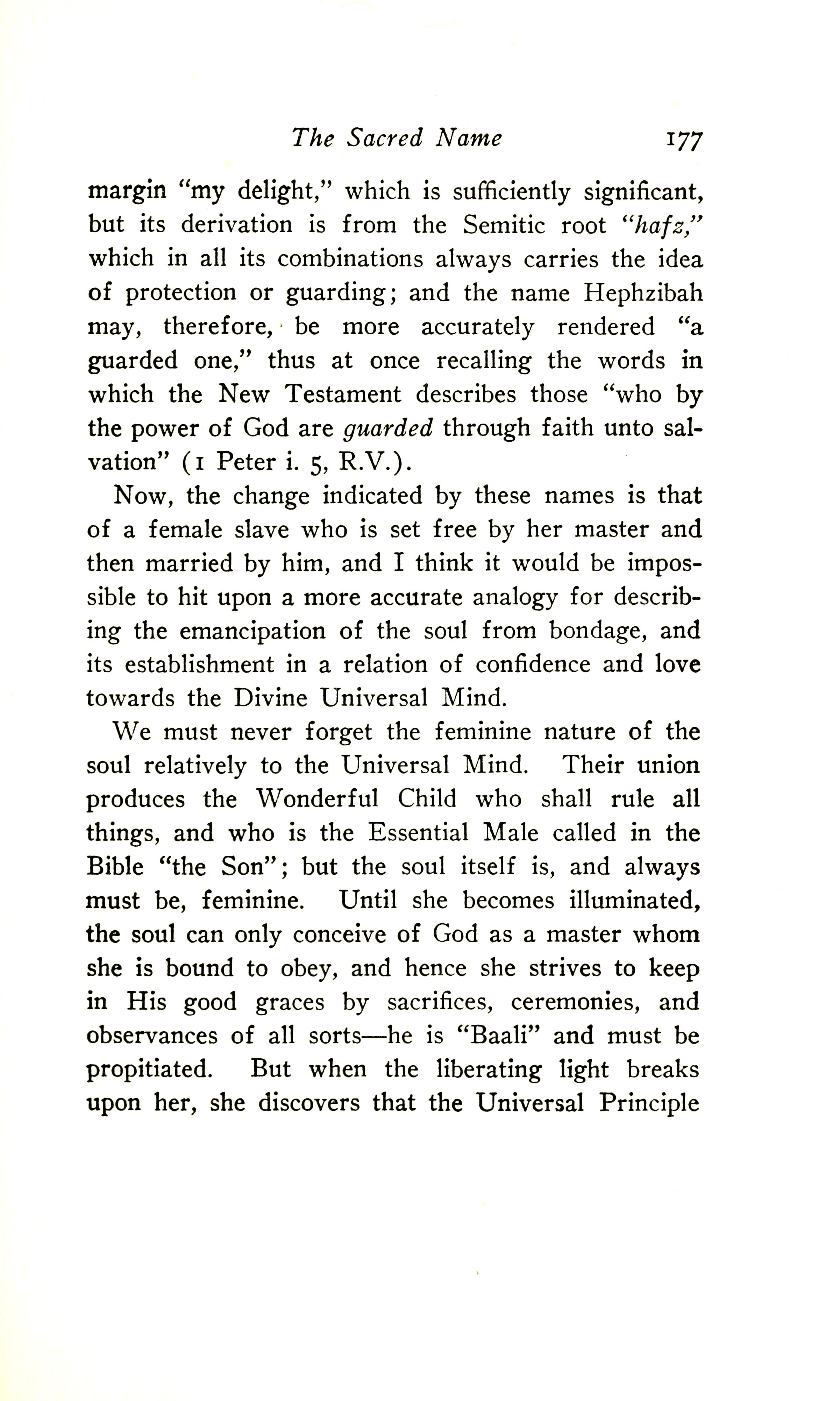 Now the change indicated by these names is that of a female slave who is set free by her master and then married by him, and I think it would be impossible to hit upon a more accurate analogy for describing the emancipation of the soul from bondage and its establishment in a relation of confidence and love towards the Divine Universal Mind.