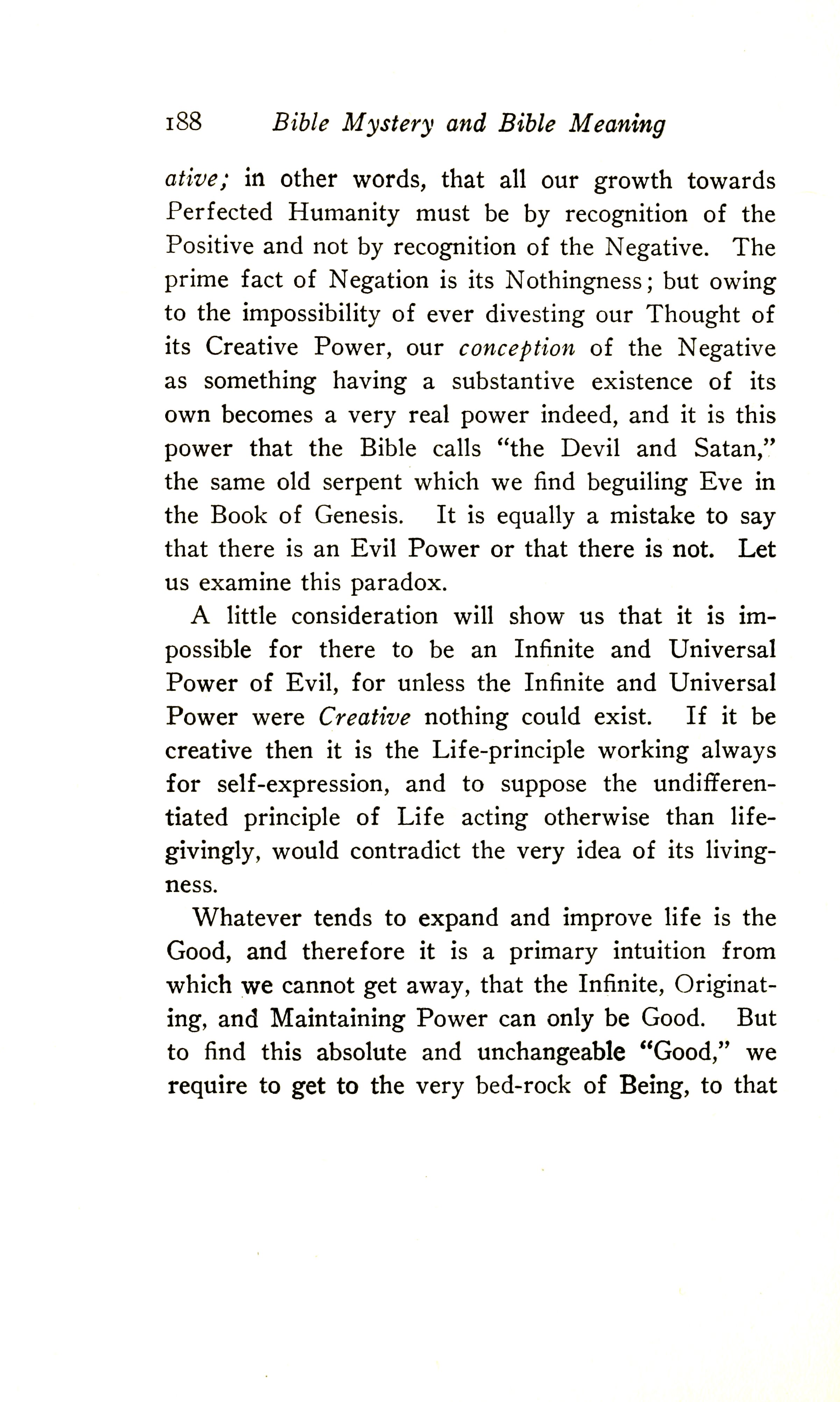 in other words, that all our growth towards Perfected Humanity must be by recognition of the Positive and not by recognition of the Negative. The prime fact of Negation is its Nothingness; but owing to the impossibility of ever divesting our Thought of its Creative Power, our conception of the Negative as something having a substantive existence of its own becomes a very real power indeed, and it is this power that the Bible calls "the Devil and Satan", the same old Serpent which we find beguiling Eve in the Book of Genesis. It is equally a mistake to say that there is an Evil Power or that there is not. Let us examine this paradox.
