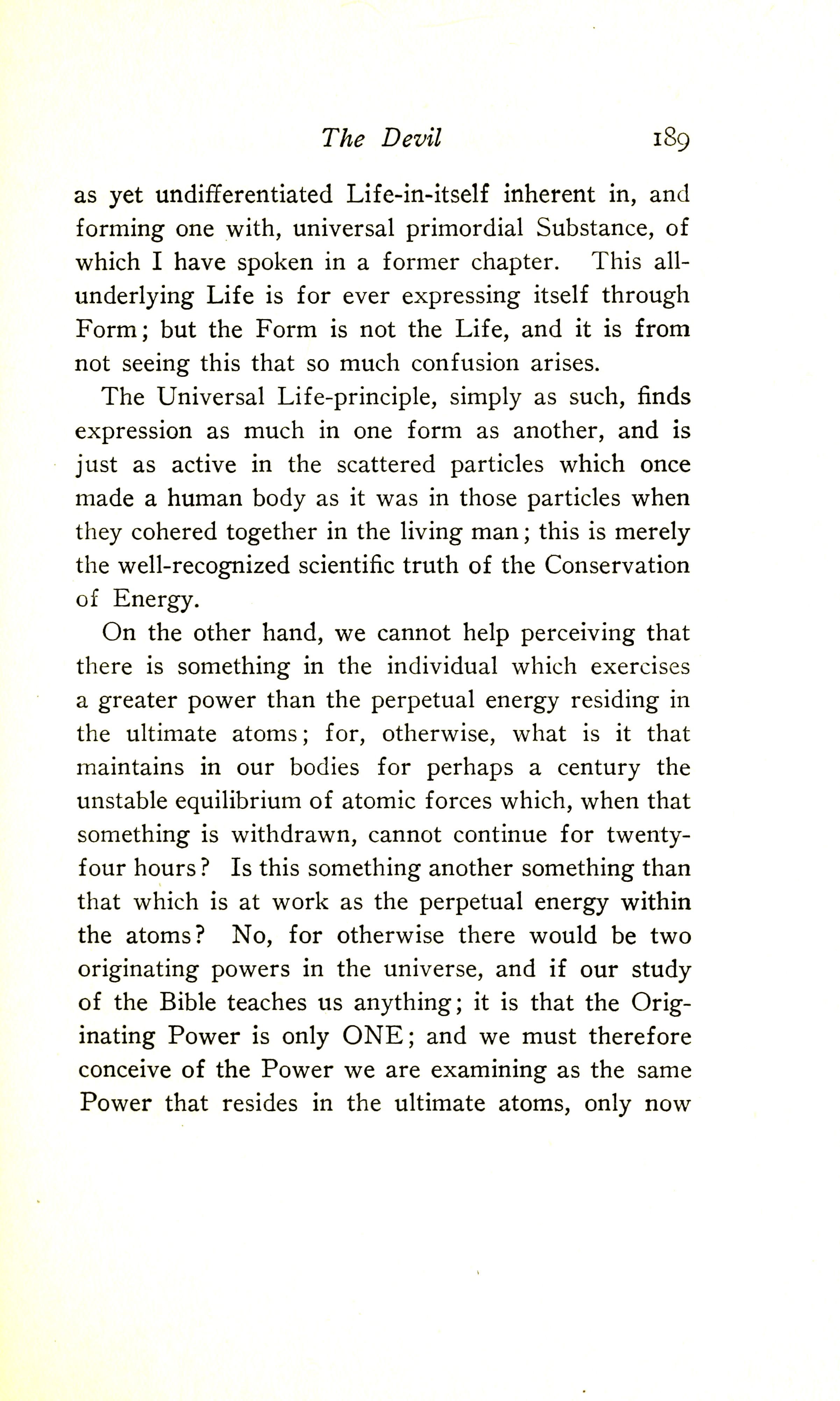 On the other hand, we cannot help perceiving that there is something in the individual which exercises a greater power than the perpetual energy residing in the ultimate atoms; for otherwise what is it that maintains in our bodies for perhaps a century the unstable equilibrium of atomic forces which, when that something is withdrawn, cannot continue for twenty-four hours? Is this something another something than that which is at work as the perpetual energy within the atoms? No, for otherwise there would be two originating powers in the Universe, and if our study of the Bible teaches us anything, it is that the Originating Power is only ONE; and we must therefore conceive of the Power we are examining as the same Power that resides in the ultimate atoms, only now