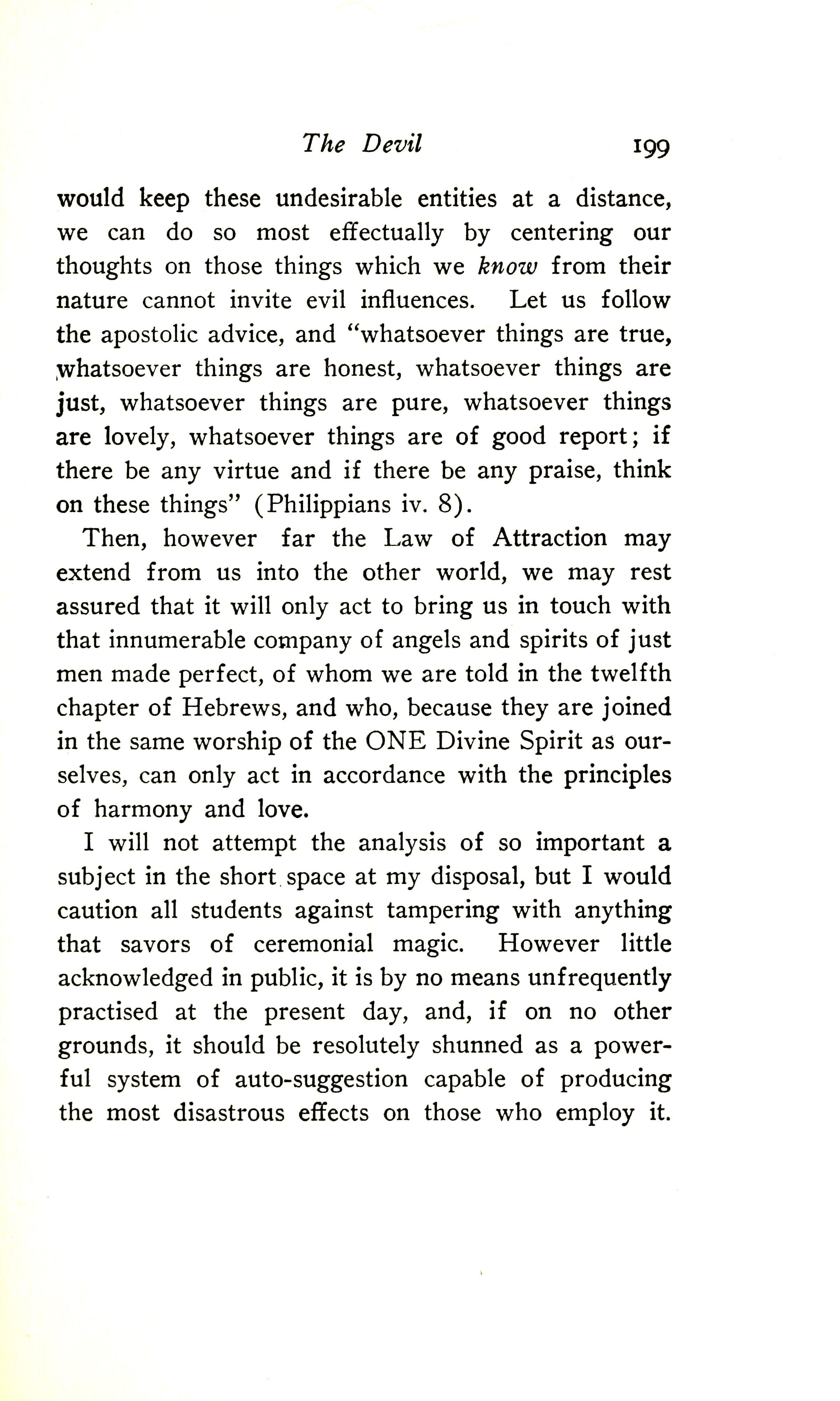 would keep these undesirable entities at a distance, we can do so most effectually by centering our thoughts on those things which we know from their nature cannot invite evil influences. Let us follow the apostolic advice, and "whatsoever things are true, whatsoever things are honest, whatsoever things are just, whatsoever things are pure, whatsoever things are lovely, whatsoever things are of good report; if there be any virtue and if there be any praise, think on these things" (Philippians 4:8). Then, however far the Law of Attraction may extend from us into the other world, we may rest assured that it will only act to bring us in touch with that innumerable company of angels and spirits of just men made perfect, of whom we are told in the twelfth chapter of Hebrews, and who, because they are joined in the same worship of the ONE Divine Spirit as ourselves, can only act in accordance with the principles of harmony and love.