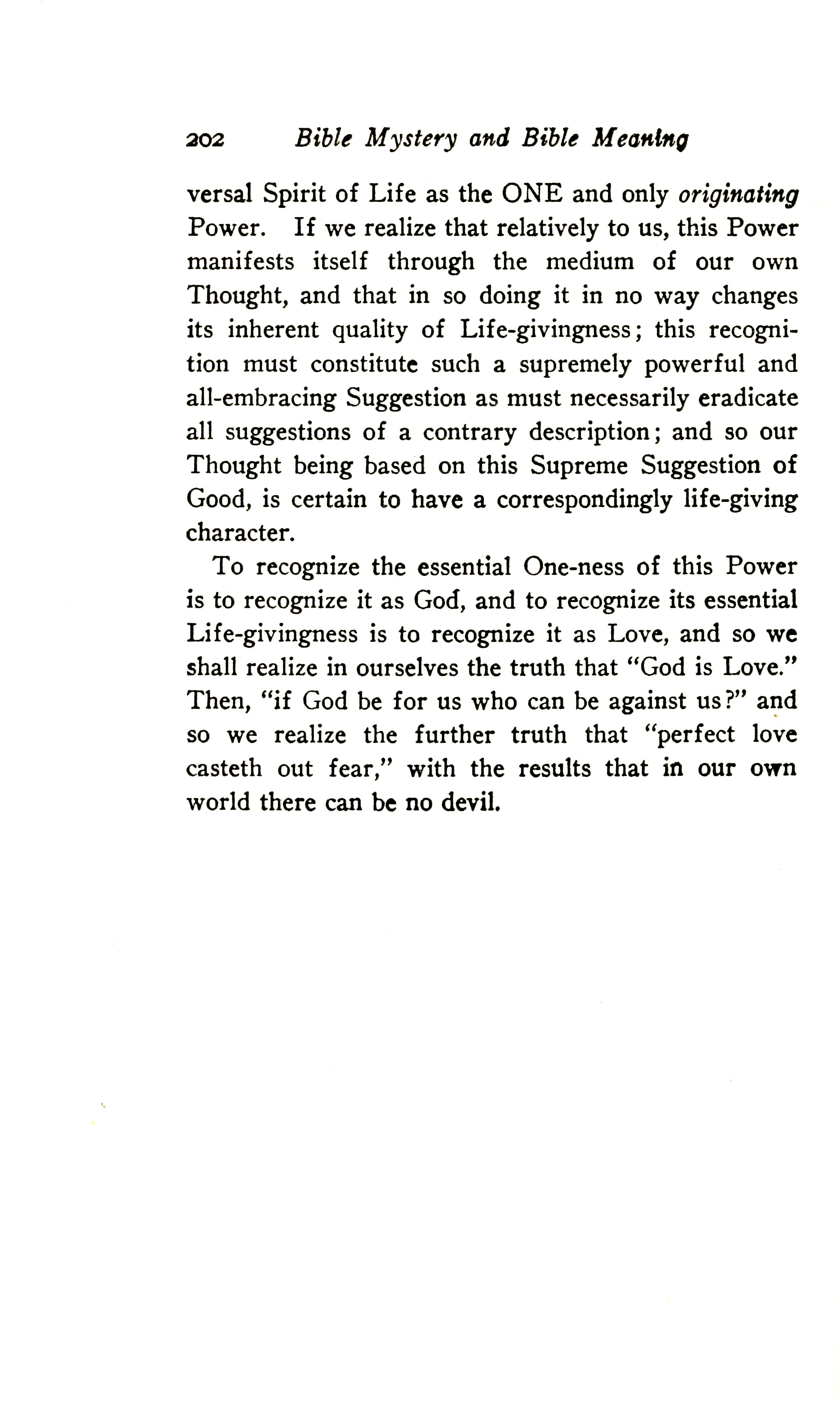 To recognise the essential One-ness of this Power is to recognise it as God, and to recognise its essential Life-givingness is to recognise it as Love, and so we shall realise in ourselves the truth that "God is Love". Then "if God be for us, who can be against us?" (Romans 8:31) and so we realise the further truth that "perfect love casteth out fear" (1 John 4:18), with the result that in our own world there can be no devil.
