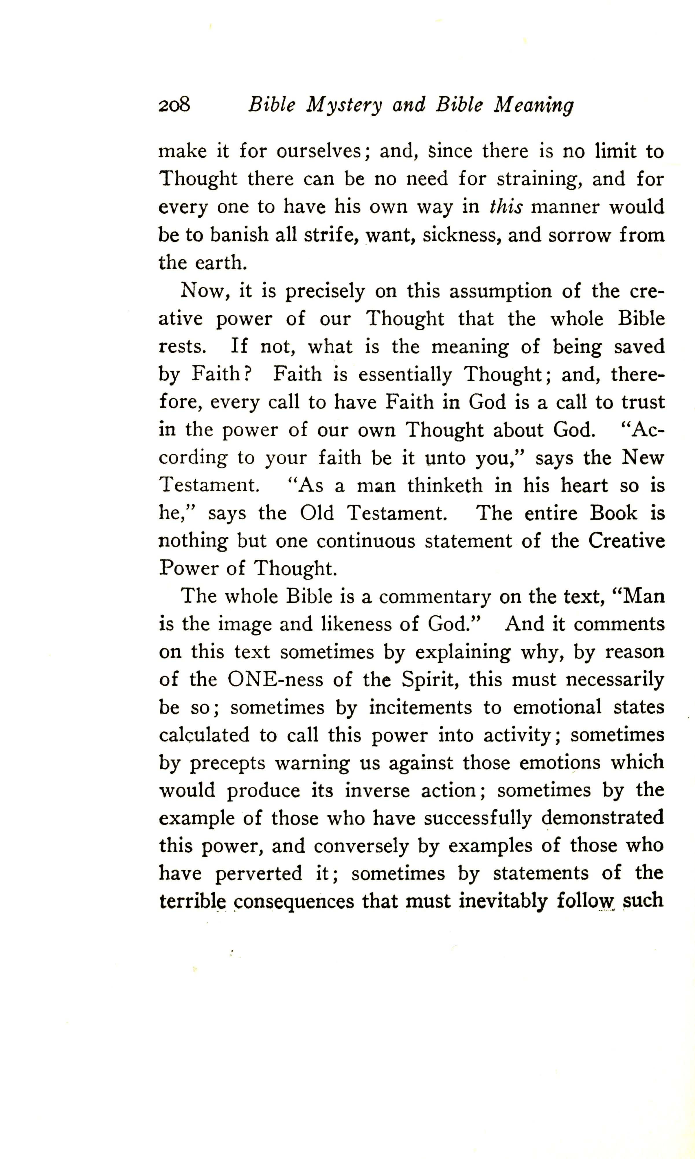 Now it is precisely on this assumption of the creative power of our Thought that the whole Bible rests. If not, what is the meaning of being saved by Faith? Faith is essentially Thought; and therefore every call to have Faith in God is a call to trust in the power of our own Thought about God. "According to your faith be it unto you", says the New Testament. "As a man thinketh in his heart, so is he", says the Old Testament. The entire Book is nothing but one continuous statement of the Creative Power of Thought.
