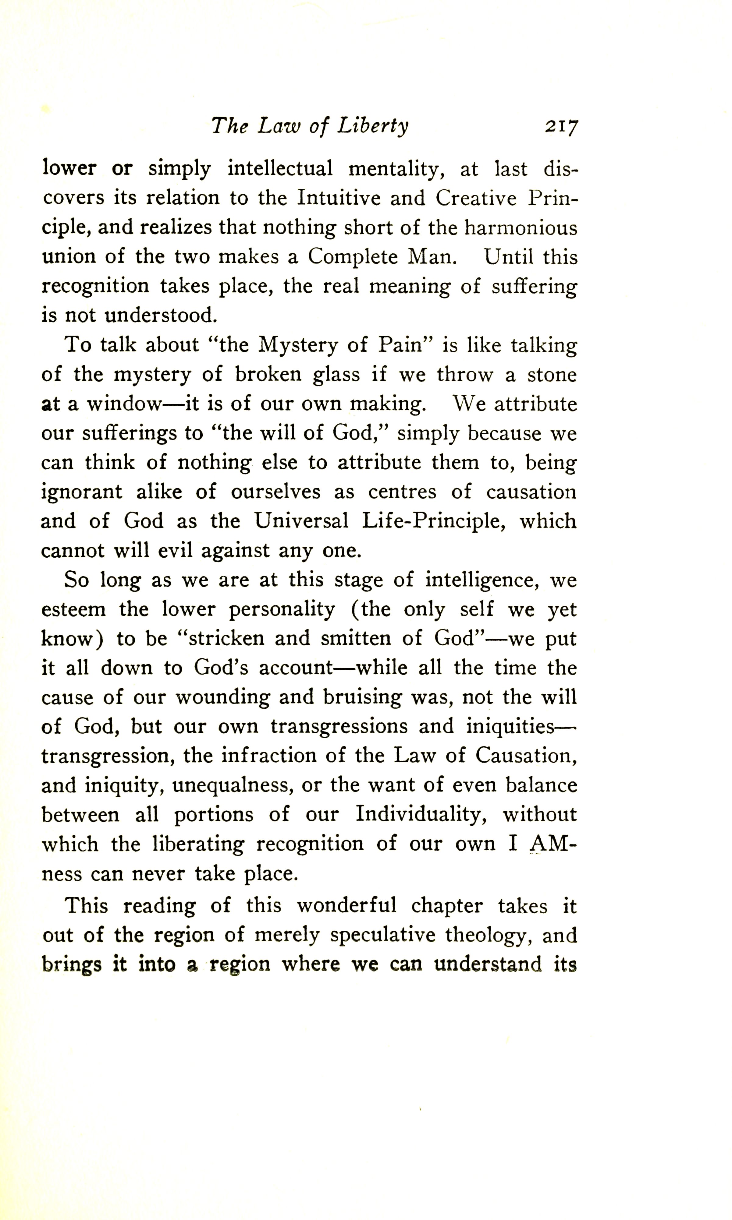 To talk about "the Mystery of Pain" is like talking of the mystery of broken glass if we throw a stone at a window --- it is of our own making. We attribute our sufferings to "the will of God" simply because we can think of nothing else to attribute them to, being ignorant alike of ourselves as centres of causation and of God as the Universal Life-Principle, which cannot will evil against anyone. So long as we are at this stage of intelligence, we esteem the lower personality (the only self we yet know) to be "stricken and smitten of God" --- we put it all down to God's account --- while all the time the cause of our wounding and bruising was not the will of God, but our own transgressions and iniquities; transgression: the infraction of the Law of causation; and iniquity: unequalness, or the want of even balance between all portions of our Individuality, without which the liberating recognition of our own I AM-ness can never take place.