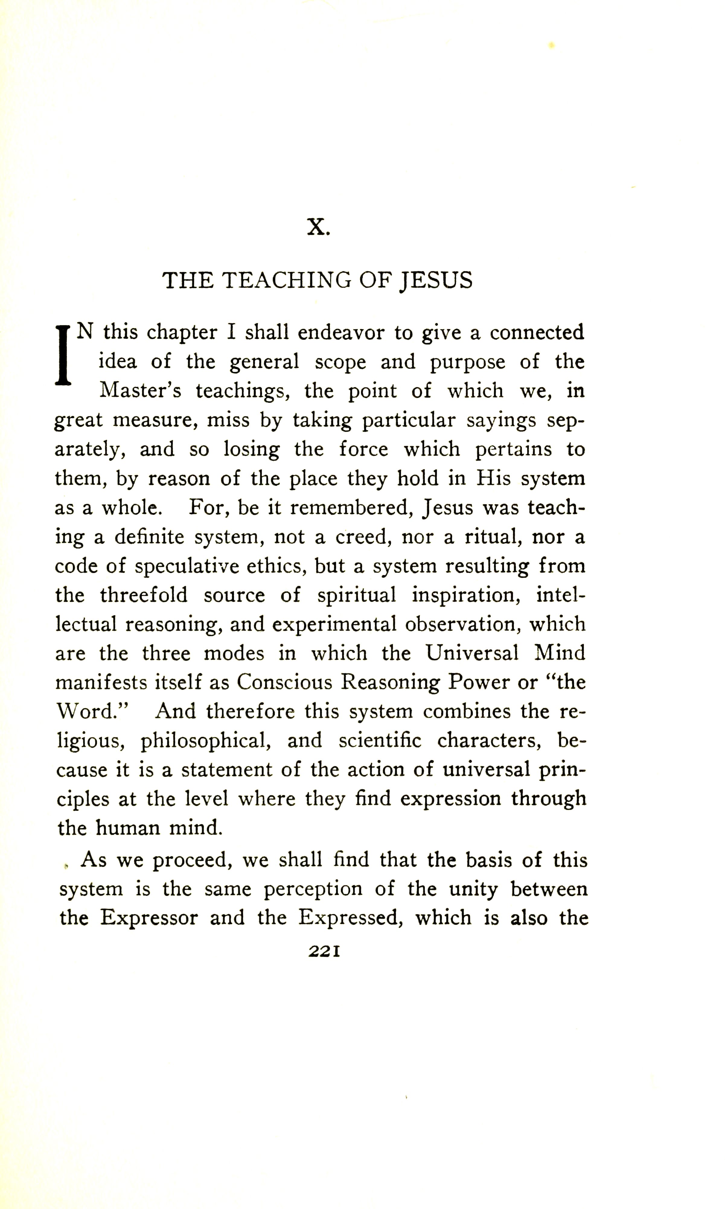 The great point to be noted in the teaching of Jesus is his statement of the absolute liberty of the individual. That was the subject of his first discourse in the synagogue of Nazareth (Luke 4:16); he continued his teaching with the statement, "the truth shall make you free"; and he finished it with the final declaration before Pilate the he had come into the world to the end that he should bear witness to the Truth (John 18:37). Thus to teach the knowledge of Liberating Truth was the beginning, the middle, and the end of the great work which the Master set before him.