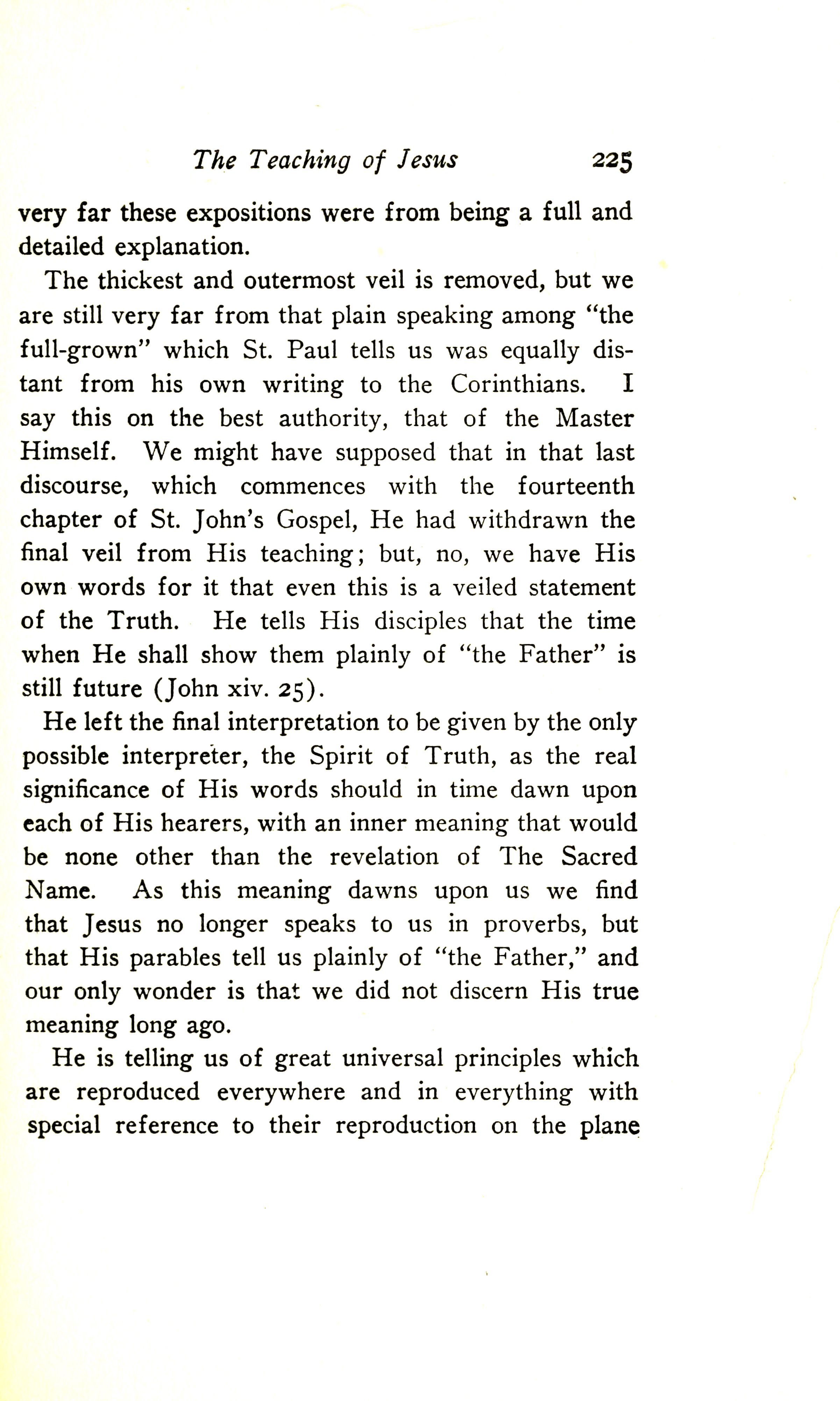 The thickest and outermost veil is removed, but we are still very far from plain speaking among "the full-grown" which St Paul tells us was equally distant from his own writing to the Corinthians. I say this on the best authority, that of the Master himself. We might have supposed that in that last discourse, which commences with the fourteenth chapter of St John's Gospel, he had withdrawn the final veil from his teaching; but no, we have his own words for it that even this is a veiled statement of the Truth. He tell his disciples that the time when he shall show them plainly of "the Father" is still future (John 16:25).
