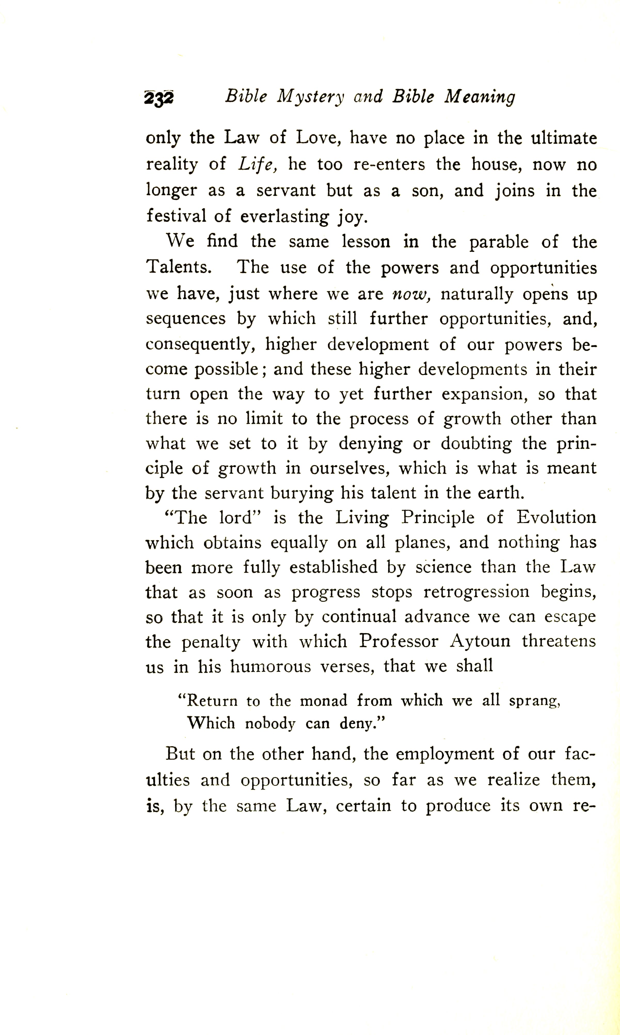 "The lord" is the Living Principle of Evolution which obtains equally on all planes, and nothing has been more fully established by science than the Law that as soon as progress stops, retrogression begins; so that it is only by continual advance we can escape the penalty with which Professor Aytoun threatens us in his humorous verse, that we shall