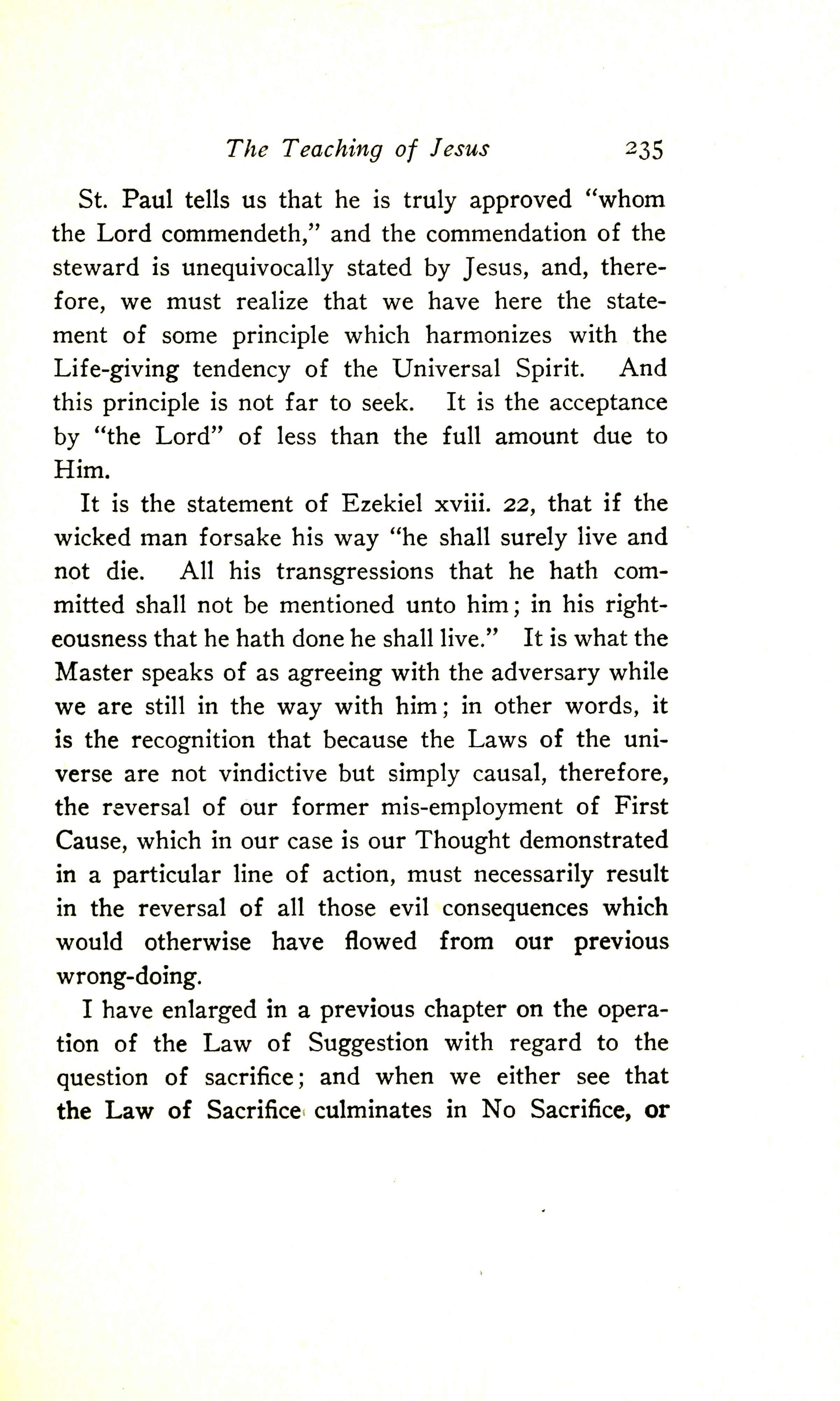 It is the statement of Ezekiel 18:21-22 that if the wicked man forsake his way, "he shall surely live and not die. All his transgressions that he hath committed shall not be mentioned unto him; in his righteousness that he hath done he shall live". It is what the Master speaks of as agreeing with the adversary while we are still in the way with him; in other words, it is the recognition that because the Laws of the Universe are not vindictive but simply causal, therefore the reversal of our former misemployment of First Cause, which in our case is our Thought demonstrated in a particular line of action, must necessarily result in the reversal of all those evil consequences which would otherwise have flowed from our previous wrong-doing.