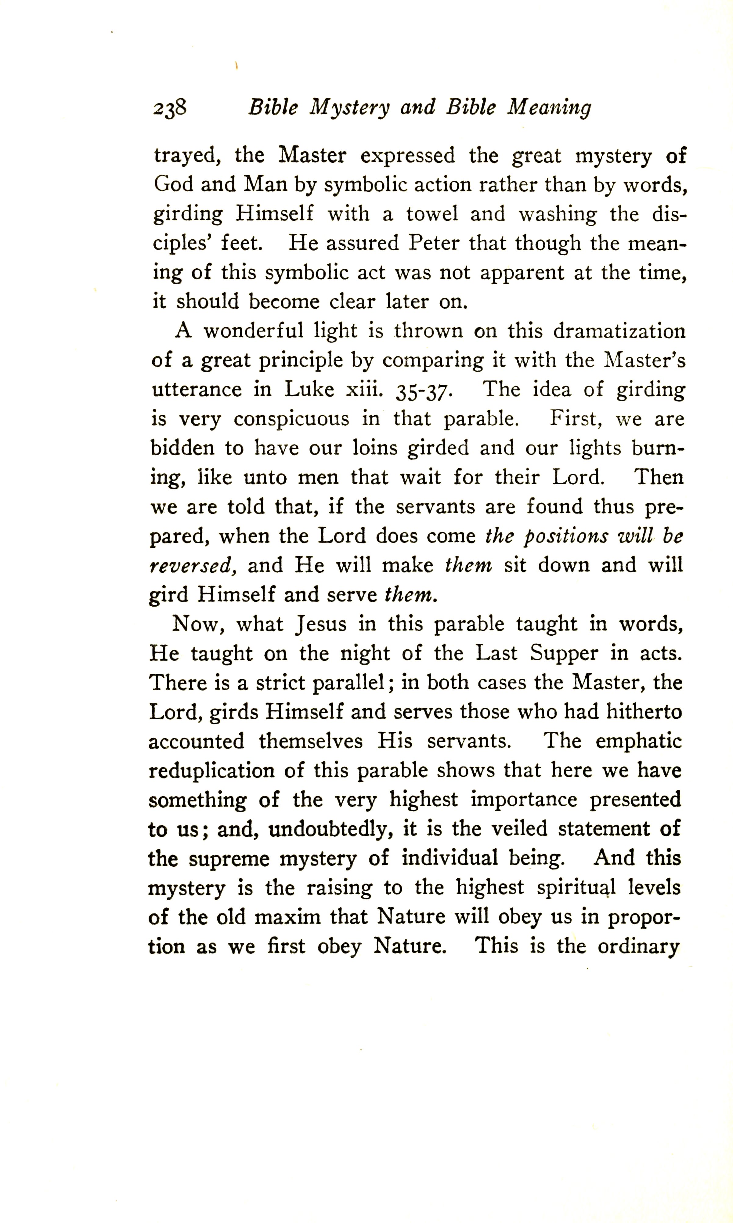 Now what Jesus in this parable taught in words, he taught on the night of the Last Supper in acts. There is a strict parallel: in both cases the Master, the Lord, girds himself and serves those who had hitherto accounted themselves as his servants. The emphatic reduplication of this parable shows that here we have something of the very highest importance presented to us; and undoubtedly it is the veiled statement of the supreme mystery of individual being. And this mystery is the raising to the highest spiritual levels of the old maxim that Nature will obey us in proportion as we first obey Nature. This is the ordinary