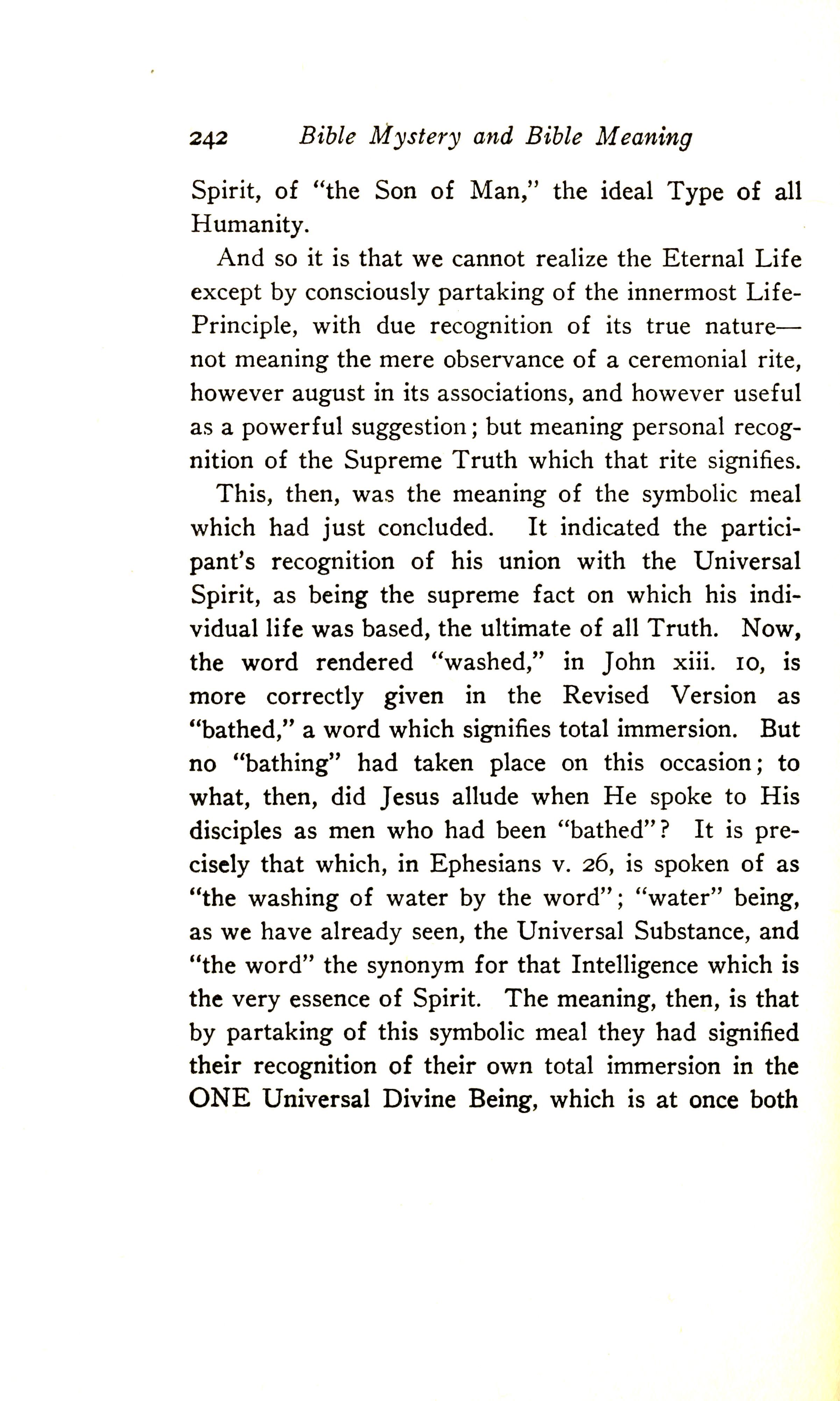 This, then, was the meaning of the symbolic meal which had just concluded. It indicated the participant's recognition of his union with the Universal Spirit as being the supreme fact on which his individual life was based, the ultimate of all Truth. Now the word rendered "washed" in John 13:10 is more correctly given in the Revised Version as "bathed", a word that signifies total immersion. But no "bathing" had taken place on this occasion; to what, then, did Jesus allude when he spoke to his disciples as men who had been "bathed"? It is precisely that which, in Ephesians 5:26, is spoken of as "the washing of water by the word", "water" being, as we have seen, the Universal Substance, and "the word" the synonym for that Intelligence which is the very essence of Spirit. The meaning, then, is that by partaking of this symbolic meal they had signified their recognition of their own total immersion in the ONE Universal Divine Being, which is at once both