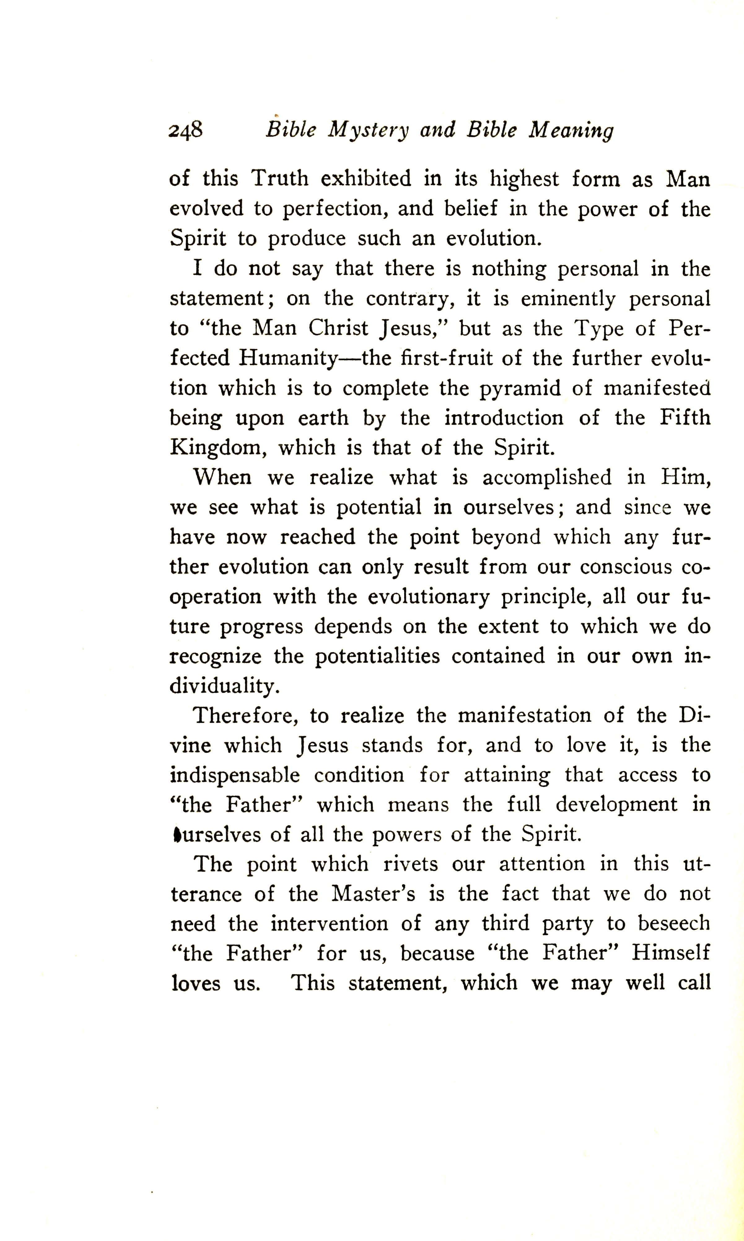 I do not say that there is nothing personal in the statement; on the contrary, it is eminently personal to "the man Christ Jesus", but as the Type of Perfected Humanity --- the first-fruit of the further evolution which is to complete the pyramid of manifested being upon earth by the introduction of the Fifth Kingdom, which is that of the Spirit. When we realise what is accomplished in him, we see what is potential in ourselves; and since we have now reached the point beyond which any further evolution can only result from our conscious co-operation with the evolutionary principle, all our future progress depends on the extent to which we do recognise the potentialities contained in our own individuality.