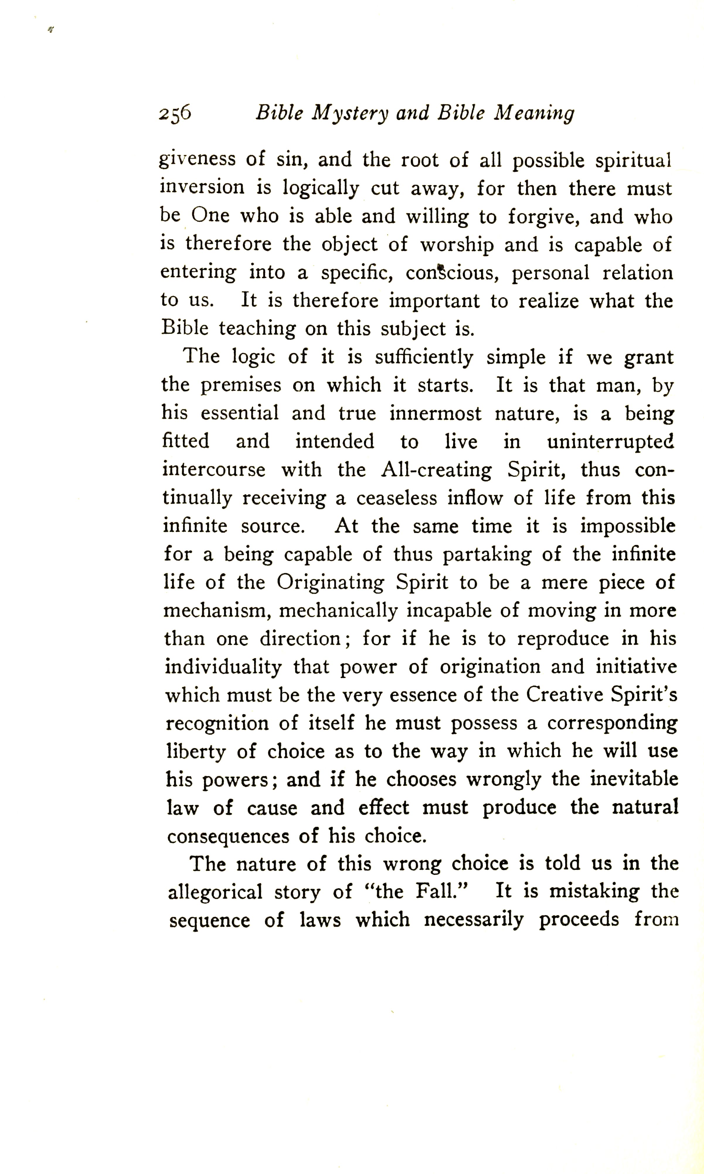 The logic of it is sufficiently simple if we grant the premise on which it starts. It is that man, by his essential and true innermost nature, is a being fitted and intended to live in uninterrupted intercourse with the All-creating spirit, thus continually receiving a ceaseless inflow of life from this infinite source. At the same time, it is impossible for a being capable of thus partaking of the infinite life of the Originating Spirit to be a mere piece of mechanism, mechanically incapable of moving in more than one direction; for if he is to reproduce in his individuality that power of origination and initiative which must be the very essence of the Creative Spirit's recognition of itself, he must possess a corresponding liberty of choice as to the way in which he will use his powers; and if he chooses wrongly, the inevitable law of cause and effect must produce the natural consequences of his choice.