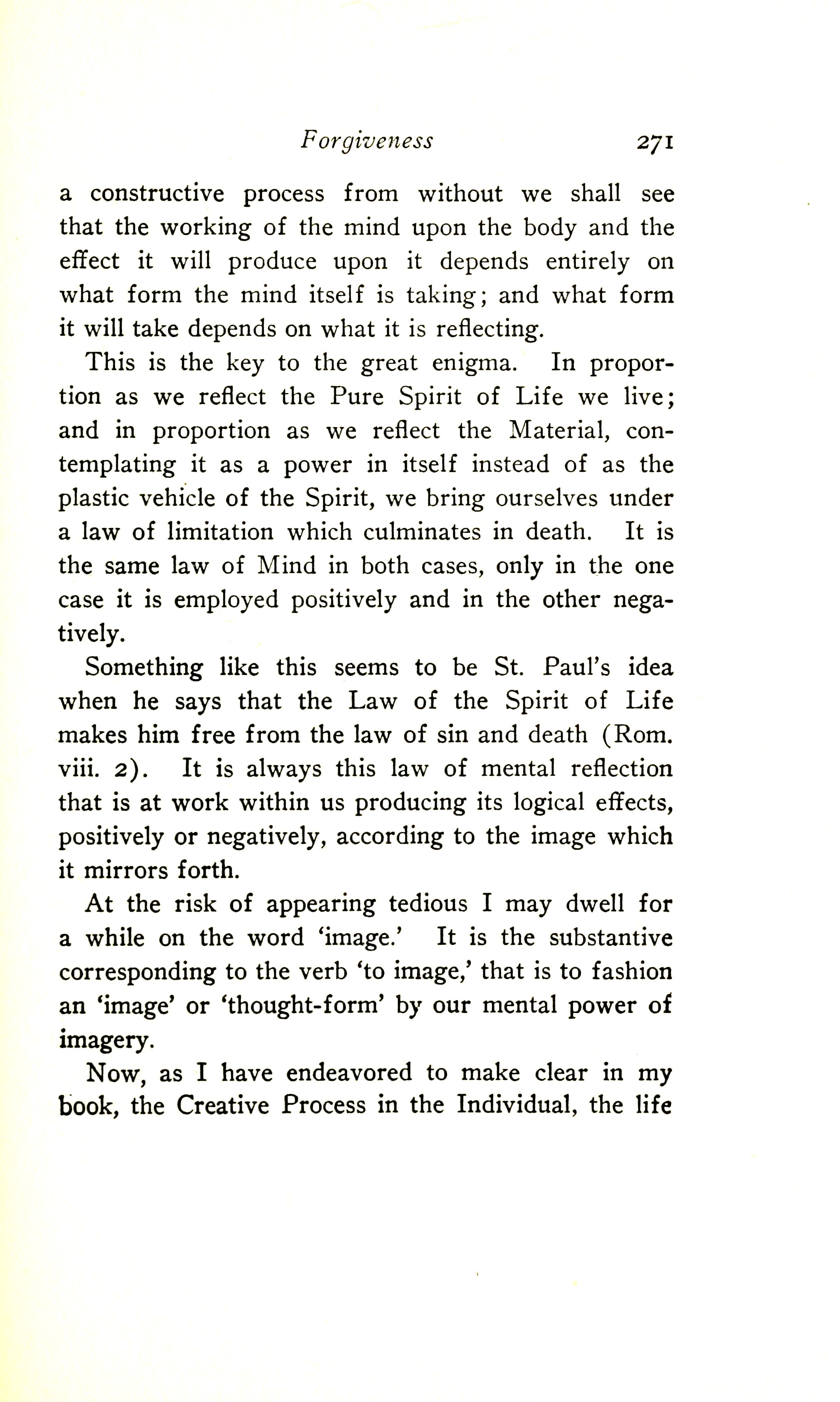 The first thing we are told about man is that he is made in the image and likeness of God, the Spirit of Life, therefore capable of manifesting a similar equality of Life. But we must note the words "image" and "likeness". They do not impart identity but resemblance. An "image" implies an original to which it conforms, and so does a "likeness". These words remind us of the passage in which St Paul speaks of our "reflecting as a mirror the glory of the Lord" and being thus "transformed into the same image from glory to glory (2 Cor. 3:18, RV). It is this same idea as in the first chapter of Genesis, only expanded so as to show the method by which the image and likeness are produced. It is by reflection. Our mind is, as it were, a mirror reflecting that towards which it is turned. This is the nature of Mind.