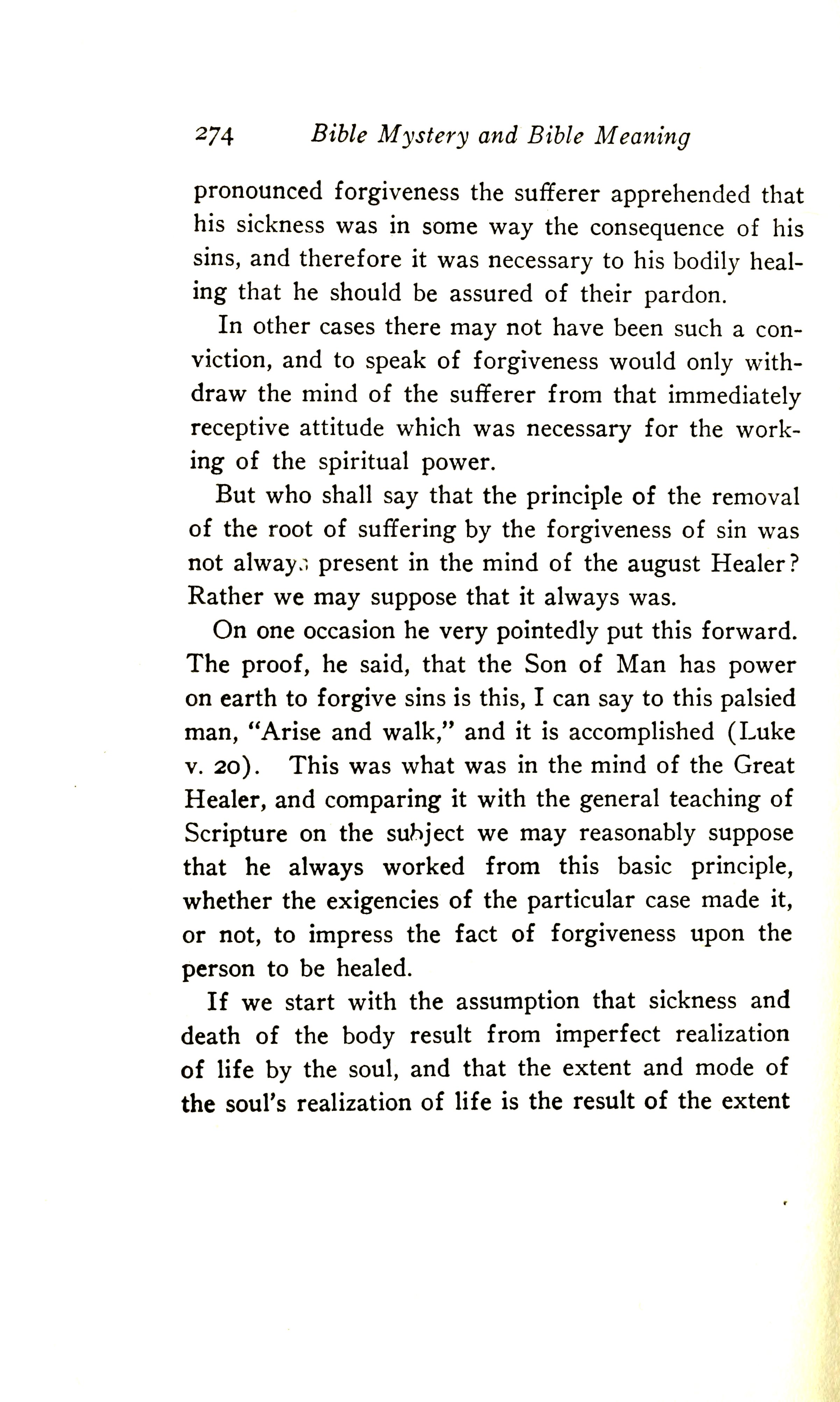 But who shall say that the principle of the removal of the root of suffering by the forgiveness of sin was not always present in the mind of the august healer? Rather we may suppose that it always was. On one occasion he very pointedly put this forward. The proof, he said, that the Son of Man has power on earth to forgive sins is this: I can say to the palsied man, "Arise and walk", and it is accomplished (Luke 5:24). This was what was in the mind of the Great Healer, and comparing it with the general teaching of Scripture on the subject, we may reasonably suppose that he always worked from this basic principle, whether the exigencies of the particular case made it, or not, desirable to impress the fact of forgiveness upon the person to be healed.