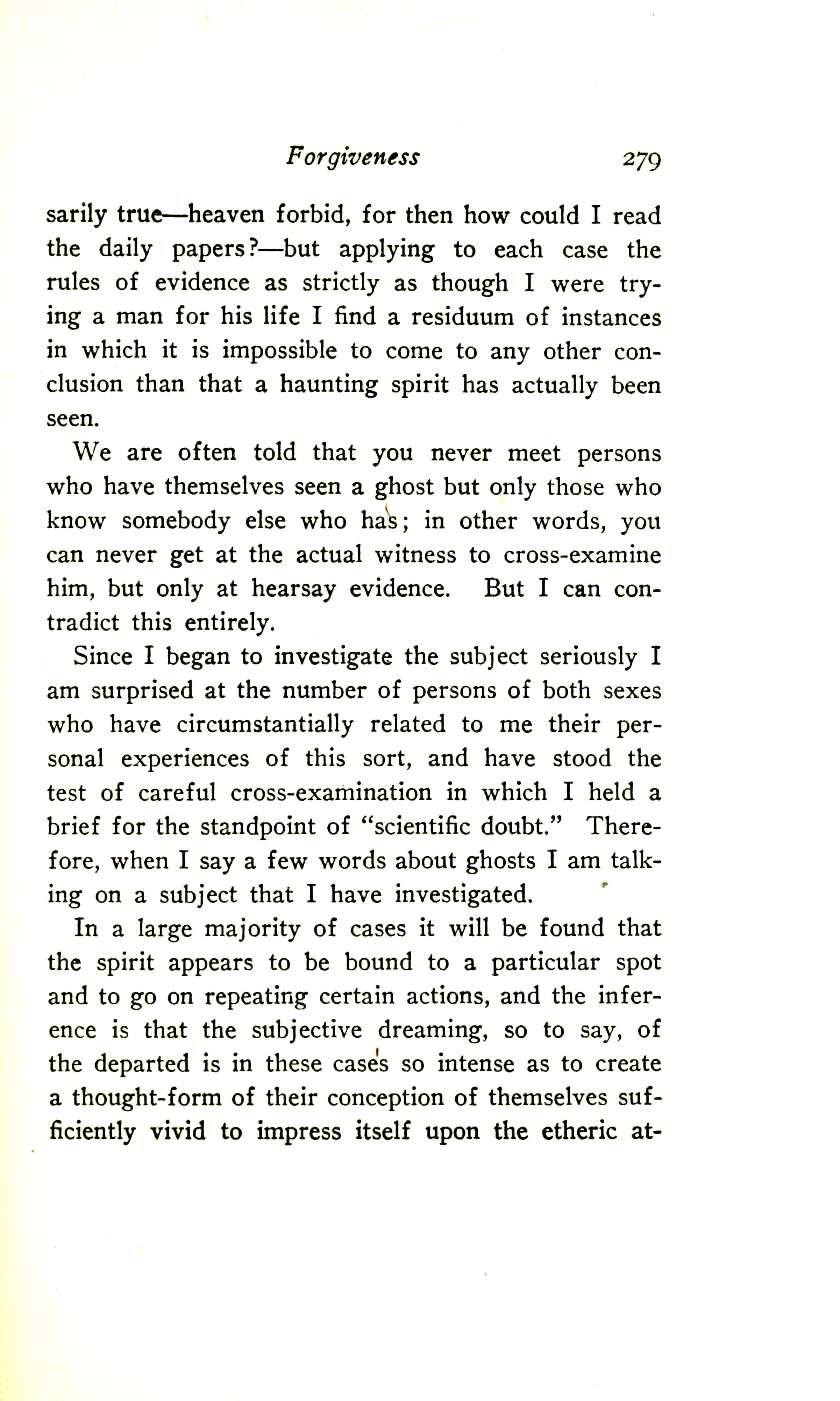We are often told that you never meet persons who have themselves seen a ghost but only those who know somebody else who has; in other words, you can never get at the actual witness to cross-examine him, but only at hearsay evidence. But I can contradict this entirely. Since I began to investigate the subject seriously, I am surprised at the number of persons of both sexes who have circumstantially related to me their personal experiences of this sort and have stood the test of careful cross-examination in which I held a brief for the standpoint of "scientific doubt". Therefore when I say a few words about ghosts, I am talking on a subject that I have investigated.