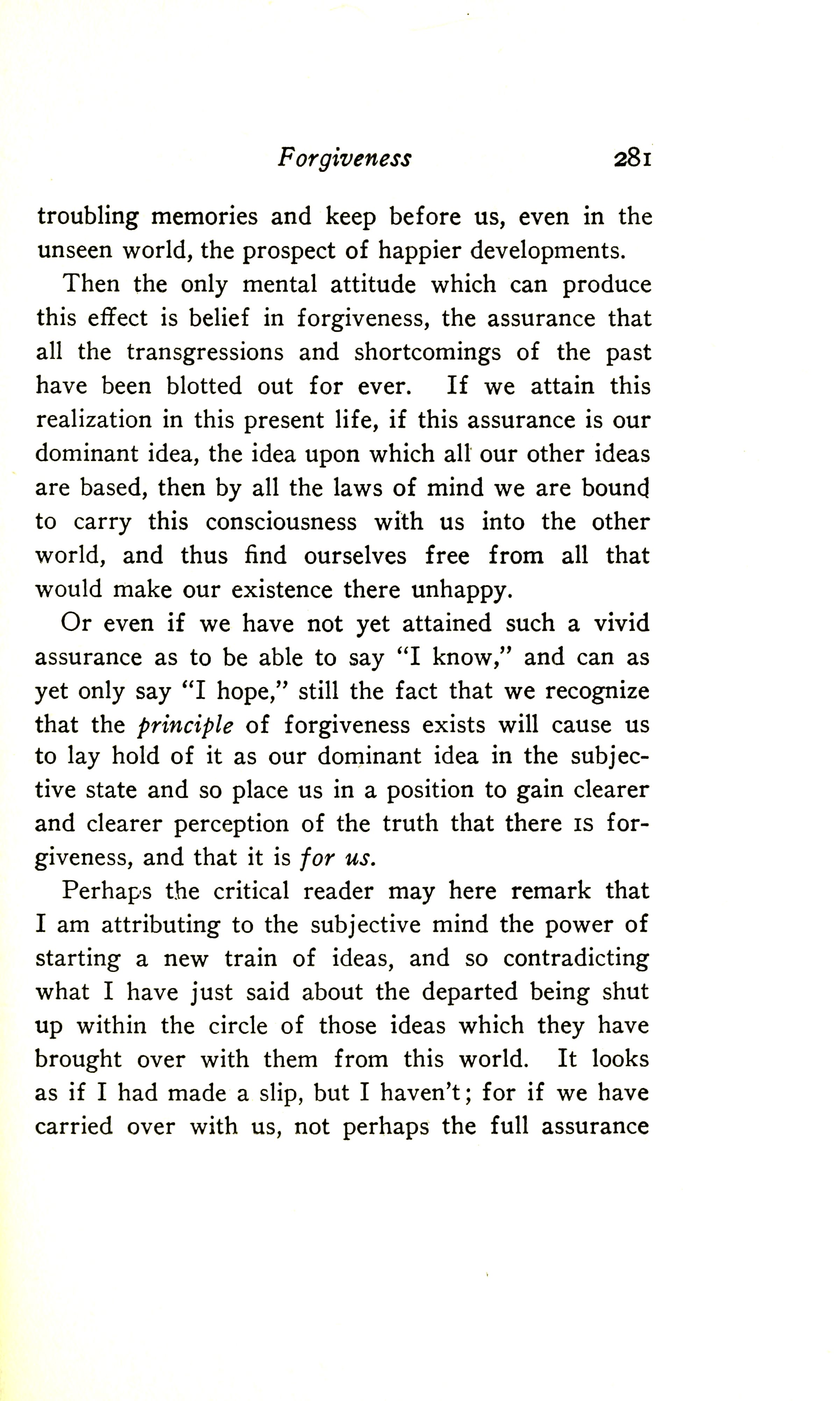 Perhaps the critical reader may here remark that I am attributing to the subjective mind the power of starting a new train of ideas, and so contradicting what I have just said about the departed being shut up within the circle of those ideas which they have brought over with them from this world. It looks as if I had made a slip, but I haven't; for if we have carried over with us --- not, perhaps, the full assurance