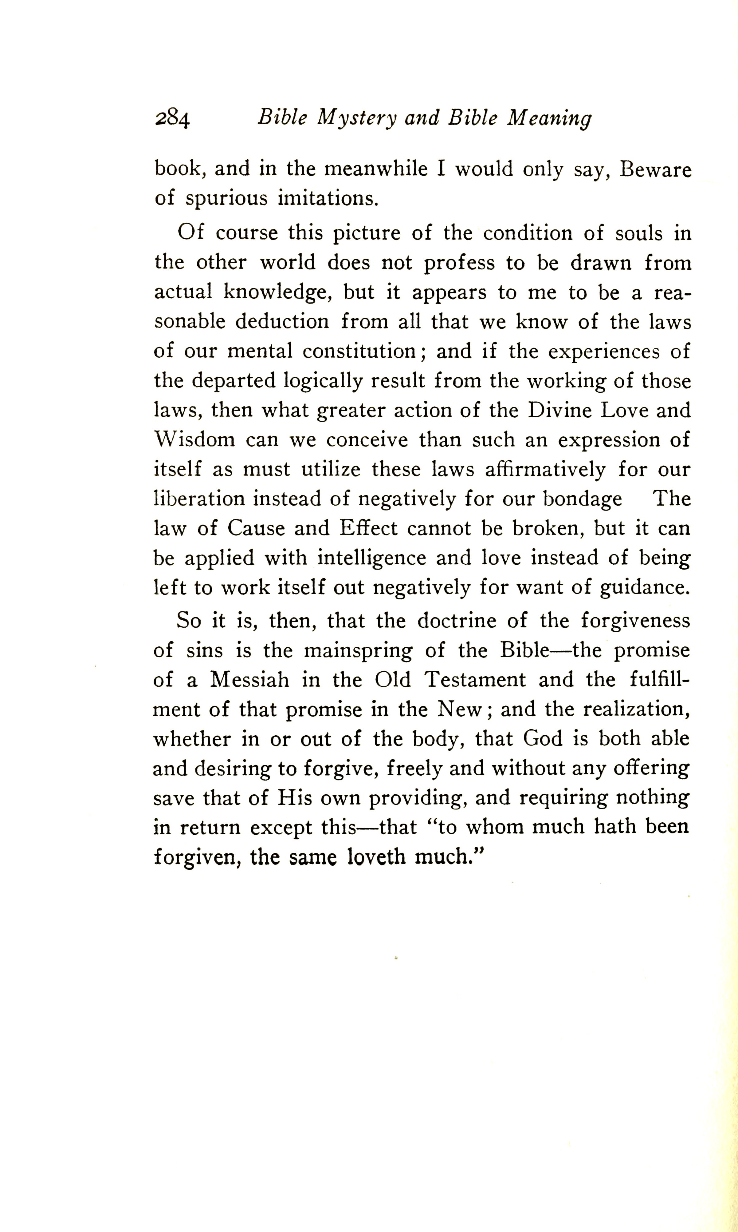So it is, then, that the doctrine of the forgiveness of sins is the mainspring of the Bible --- the promise of a Messiah in the Old Testament and the fulfilment of that promise in the New --- and the realisation, whether in or out of the body, that God is both able and desiring to forgive, freely and without any offering save that of His own providing, and requiring nothing in return except this: that "to whom much hath been forgiven, the same loveth much".