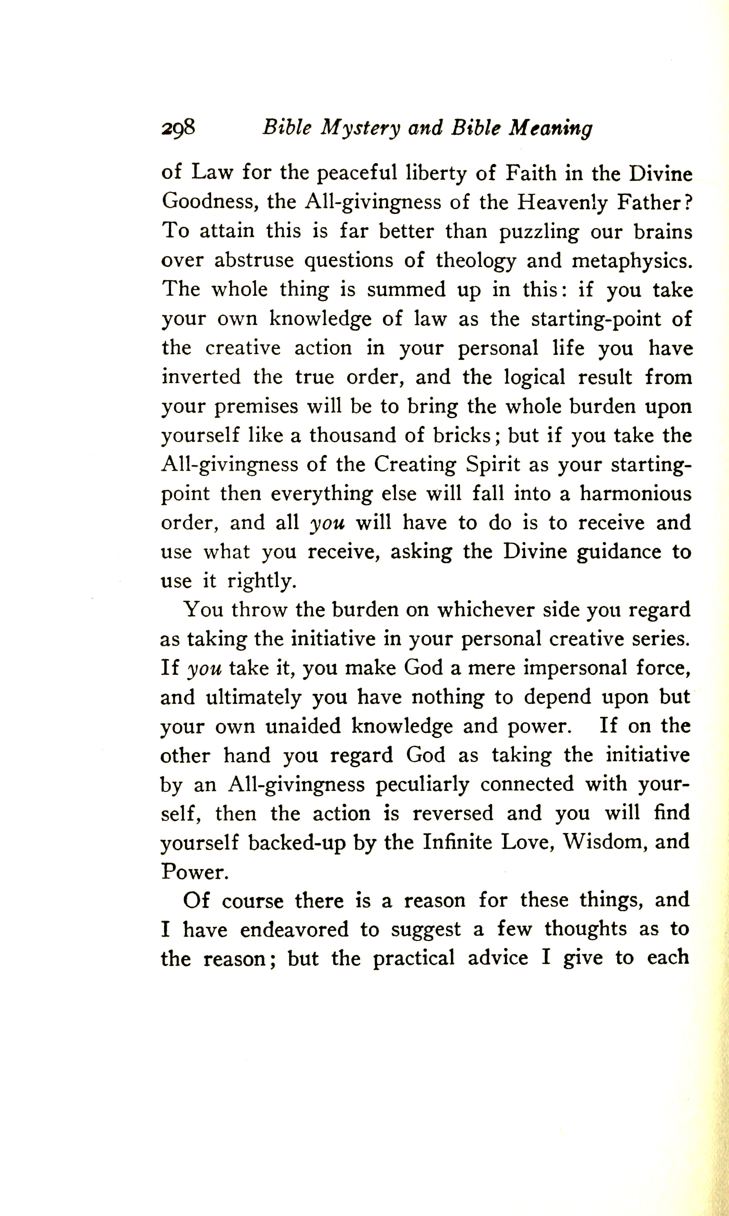 You throw the burden on whichever side you regard as taking the initiative in your personal creative series. If you take it, you make God a mere impersonal force, and ultimately you have nothing to depend on but your own unaided knowledge and power. If on the other hand you regard God as taking the initiative by an All-givingness peculiarly connected with yourself, then the action is reversed and you will find yourself backed up by the Infinite Love, Wisdom, and Power.