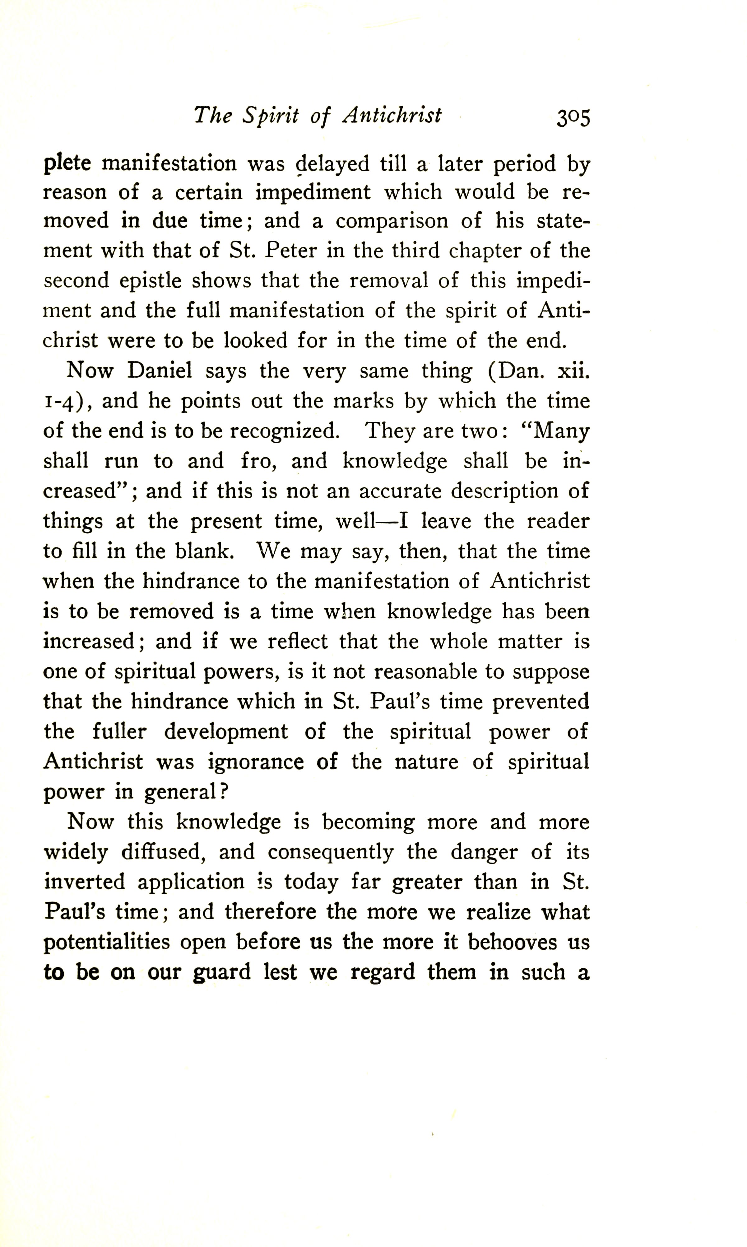 Now Daniel says the very same thing (Dan. 12:1-4), and he points out the marks by which the time of the end is to be recognised. They are two: "Many shall run to and fro, and knowledge shall be increased"; and if this is not an accurate description of things at the present time, well --- I leave the reader to fill in the blank. We may say, then, that the time when the hindrance to the manifestation of Antichrist is to be removed is a time when knowledge has been increased; and if we reflect that the whole matter is one of spiritual powers, is it not reasonable to suppose that the hindrance which in St Paul's time prevented the fuller development of the spiritual power of Antichrist was ignorance of the nature of spiritual power in general?