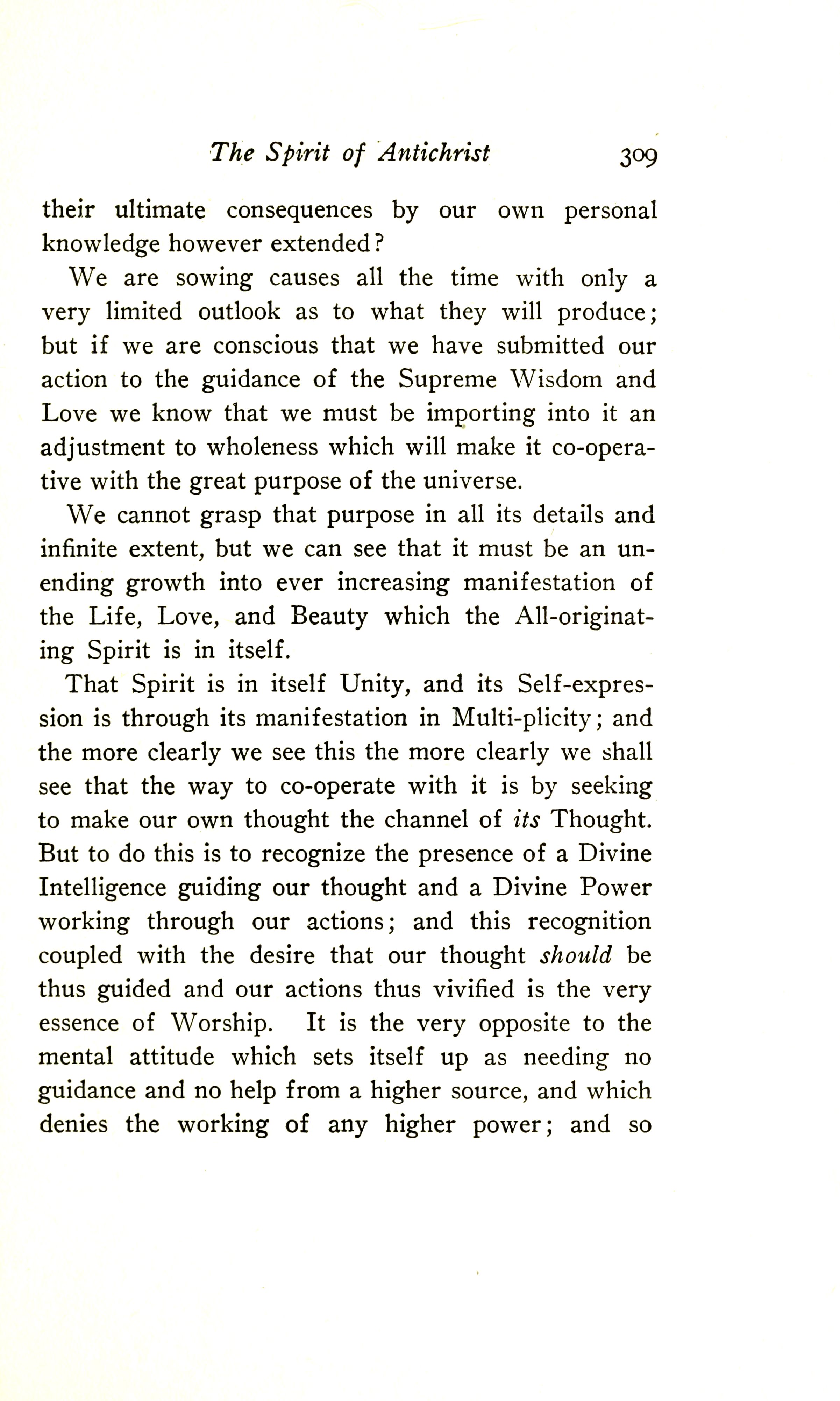 That Spirit is in itself Unity, and its Self-expression is through its manifestation in Multiplicity; and the more clearly we see this, the more clearly we shall see that the way to co-operate with it is by seeking to make our own thought the channel of its Thought. But to do this is to recognise the presence of a Divine Intelligence guiding our thought and a Divine Power working through our actions; and this recognition, coupled with the desire that our thought should be thus guided and our actions thus vivified, is the very essence of Worship. It is the very opposite to the mental attitude which sets itself up as needing no guidance and no help from a higher source, and which denies the working of any higher power; and so