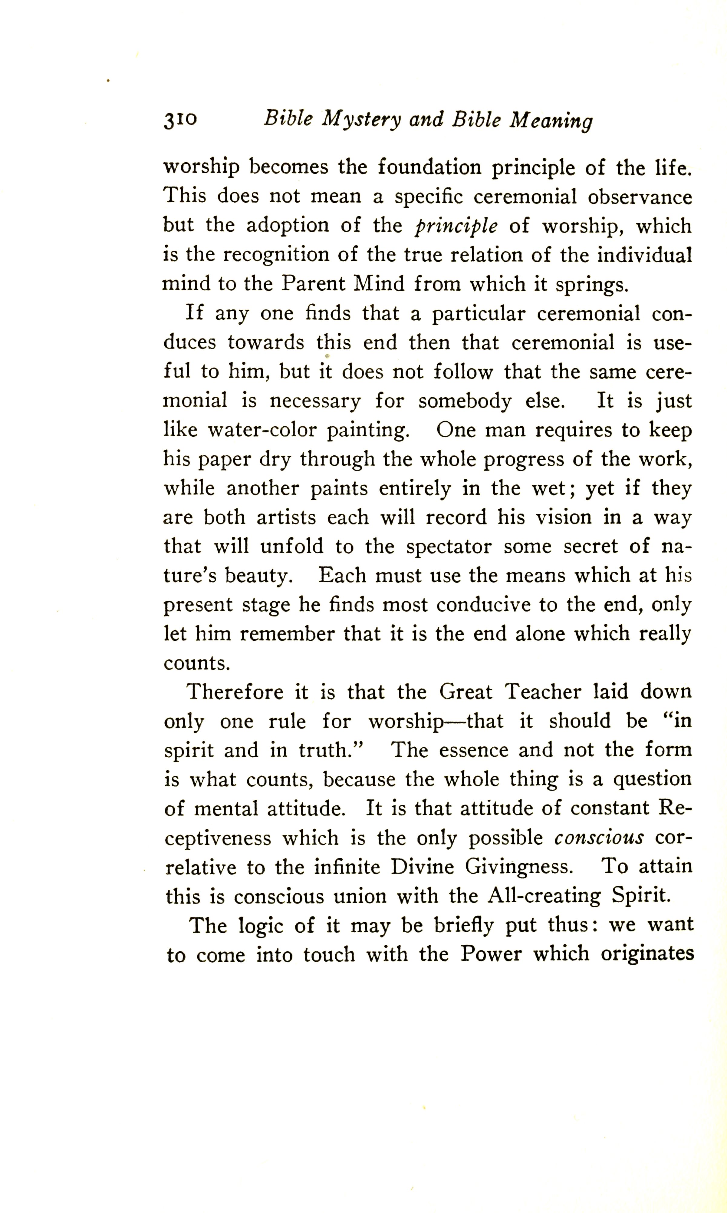 If anyone finds that a particular ceremonial conduces towards this end, then that ceremonial is useful to him, but it does not follow that the same ceremonial is necessary for somebody else. It is just like water-colour painting. One man requires to keep his paper dry through the progress of the work, while another paints entirely in the wet; yet if they are both artists, each will record his vision in a way that will unfold to the spectator some secret of nature's beauty. Each must use the means which at his present stage he finds most conducive to the end, only let him remember that it is the end alone which really counts.