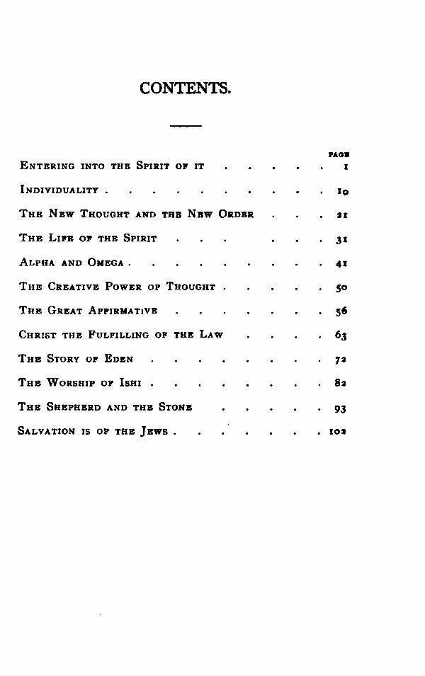 Contents - Foreword - Entering Into The Spirit Of It - Individuality - The New Thought and The New Order - The Life of The Spirit - Alpha and Omega - Creative Power of Thought - The Great Affirmative - Christ the Fulfilling of the Law - The Story of Eden - The Worship of Ishi - The Shepherd and the Stone - Salvation is of the Jews -