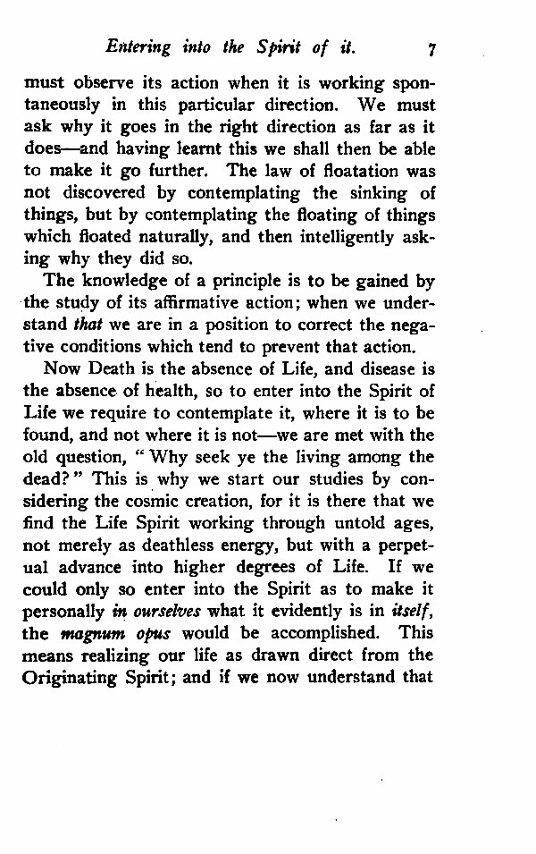 Now Death is the absence of Life, and disease is the absence of health, so to enter into the Spirit of Life we require to contemplate it, where it is to be found, and not where it is not- -we are met with the old question, "Why seek ye the living among the dead?" This is why we start our studies by considering the cosmic creation, for it is there that we find the Life Spirit working through untold ages, not merely as deathless energy, but with a perpetual advance into higher degrees of Life. If we could only so enter into the Spirit as to make it personally in ourselves what it evidently is in itself, the magnum opus would be accomplished. This means realizing our life as drawn direct from the Originating Spirit; and if we now understand that