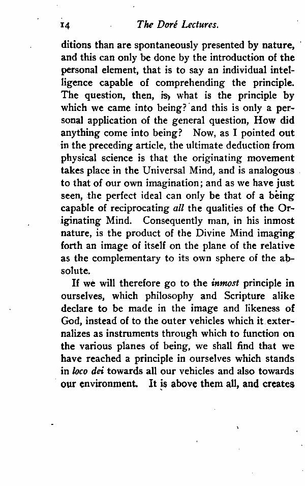 conditions than are spontaneously presented by nature, and this can only be done by the introduction of the personal element, that is to say an individual intelligence capable of comprehending the principle. The question, then, is, what is the principle by which we came into being? and this is only a personal application of the general question, How did anything come into being? Now, as I pointed out in the preceding article, the ultimate deduction from physical science is that the originating movement takes place in the Universal Mind, and is analogous to that of our own imagination; and as we have just seen, the perfect ideal can only be that of a being capable of reciprocating all the qualities of the Originating Mind. Consequently man, in his inmost nature, is the product of the Divine Mind imaging forth an image of itself on the plane of the relative as the complementary to its own sphere of the absolute.